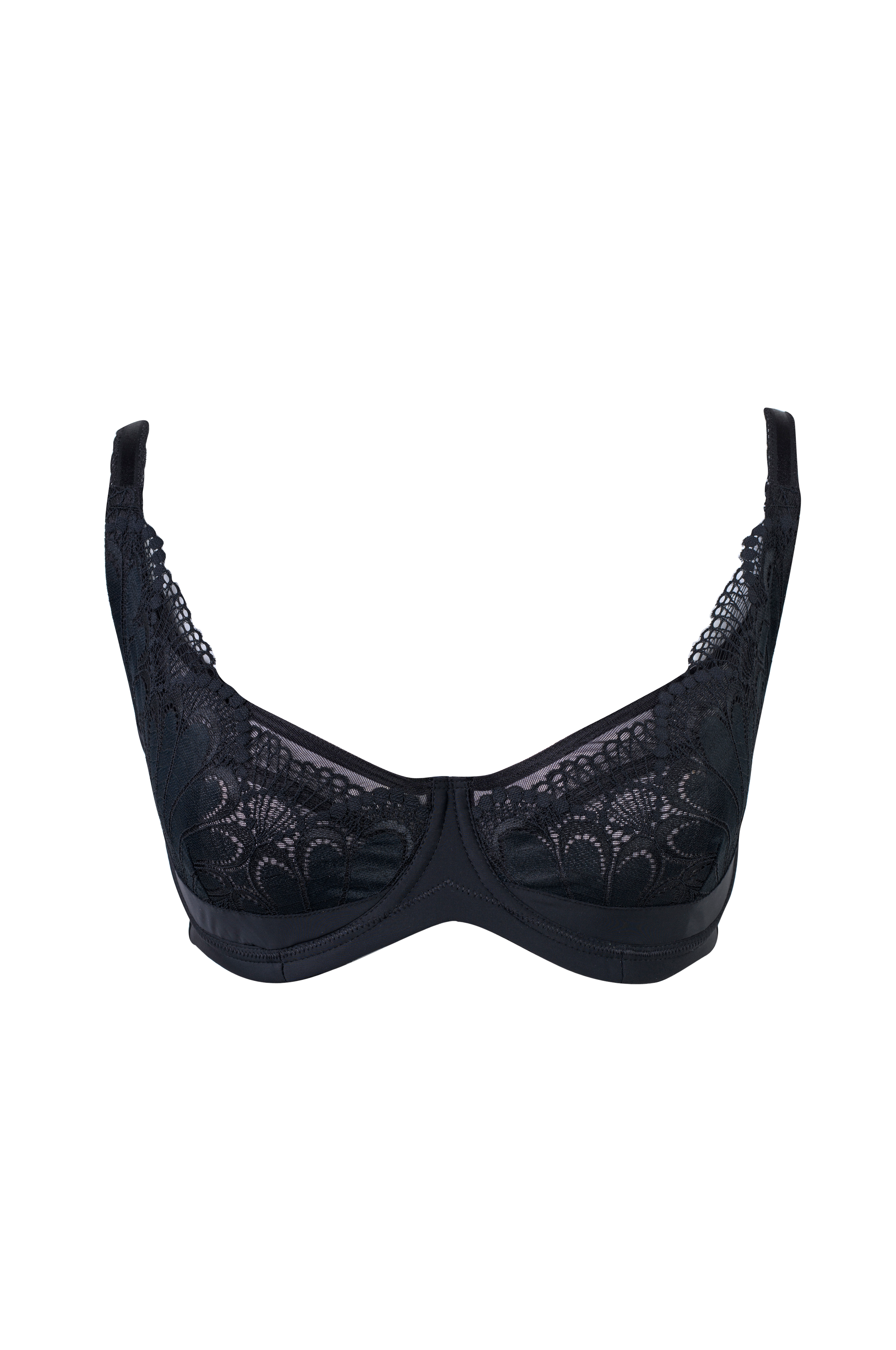Bøjle-bh med uvatterede skåle i to lag med mesh og blonde. Regulerbare skulderstropper med blondekanter. Hægte/mallelukning bagpå.