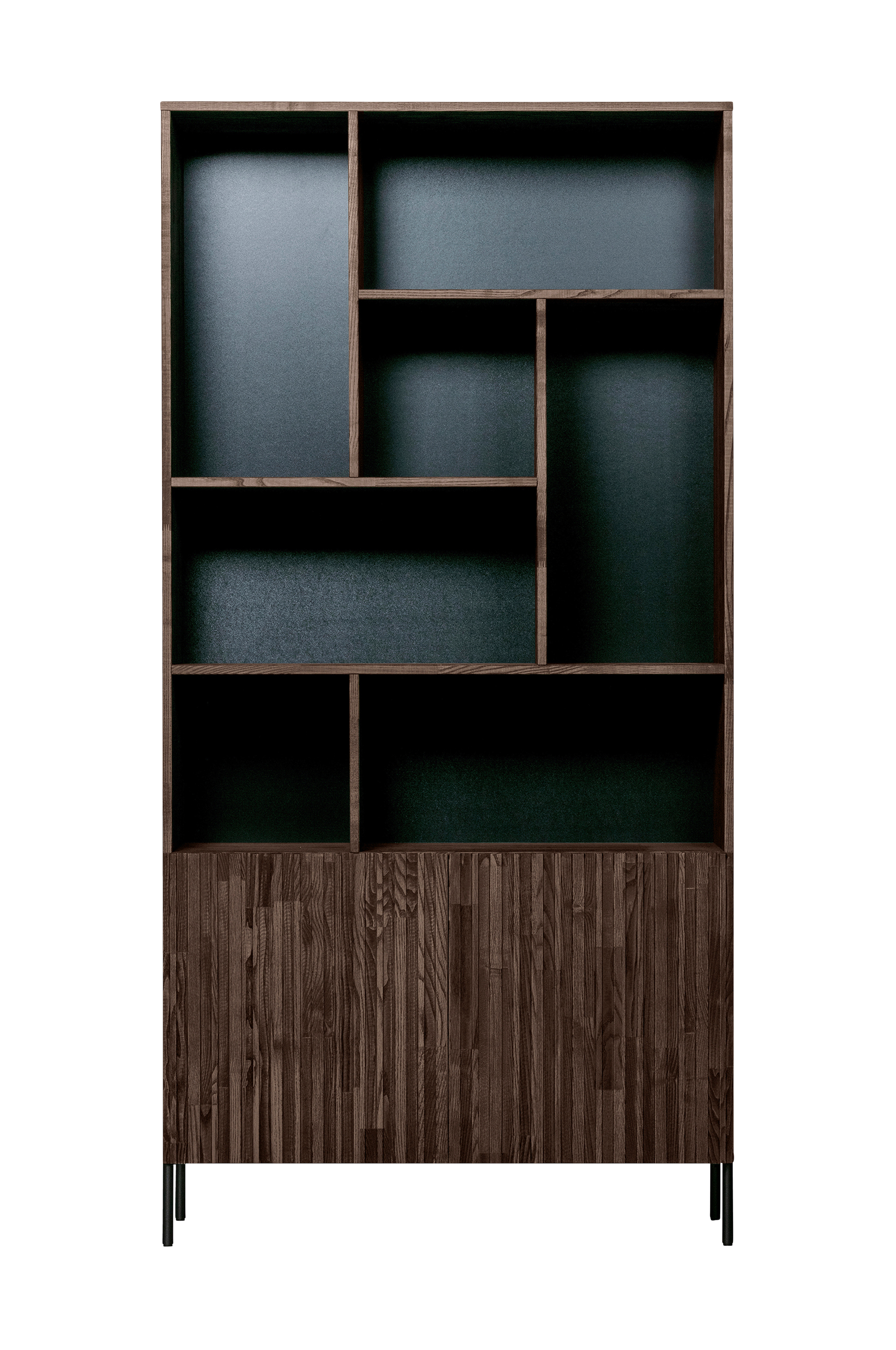Dette høje skab med legende rum er baseret på naturlig eg og låger af naturligt eg kombineret med en sorte metalbund (højde på 15 cm). Skabets indermateriale er lamineret spånplade.
