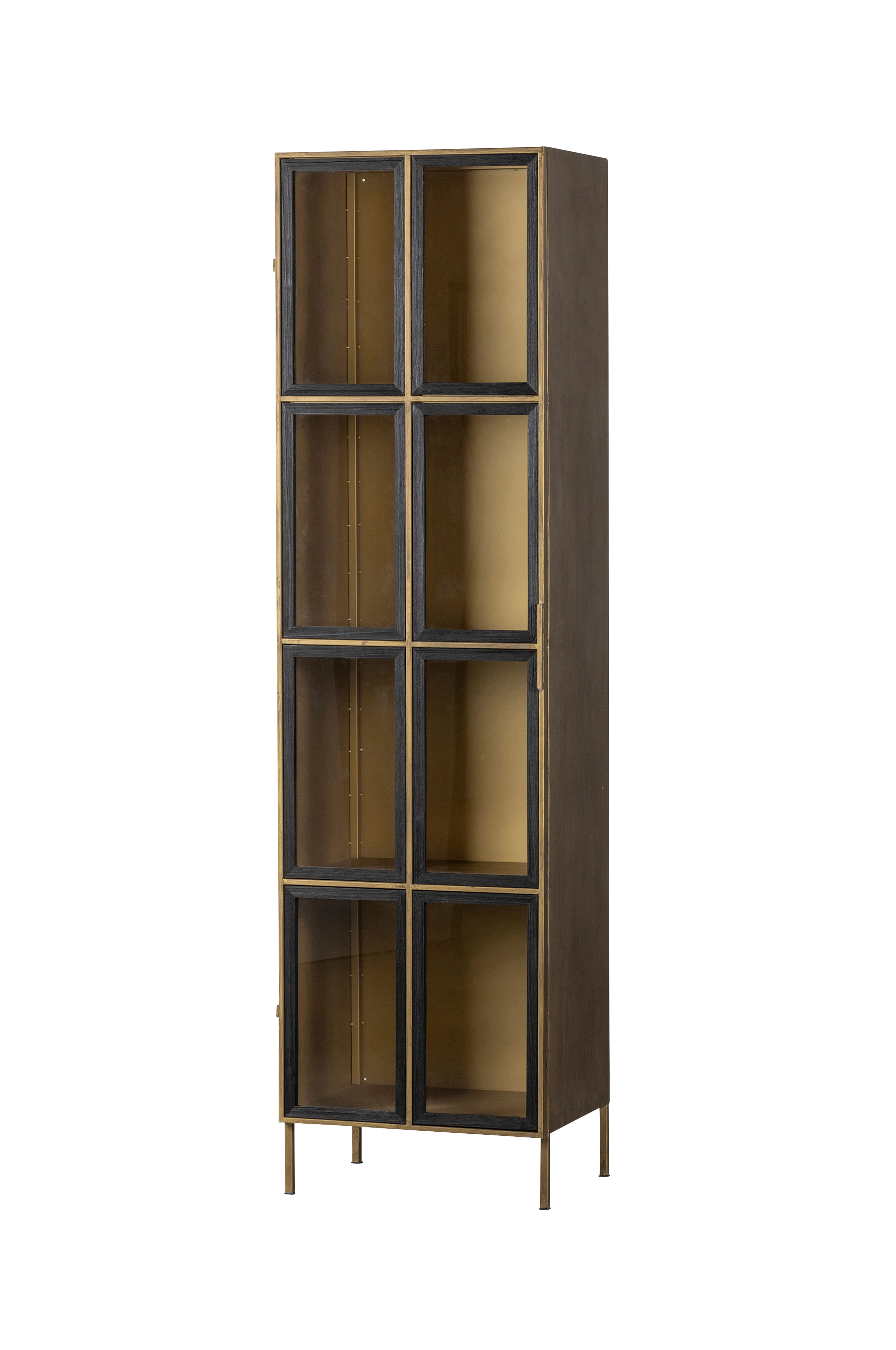 Holy vitrineskab i smalt design fra det hollandske mærke WOOOD er rummeligt og fremstillet af metal med antik messingfinish. Lågen har otte transparente glasplader med træramme. Lågen lukkes vha. en magnet bag håndtaget.