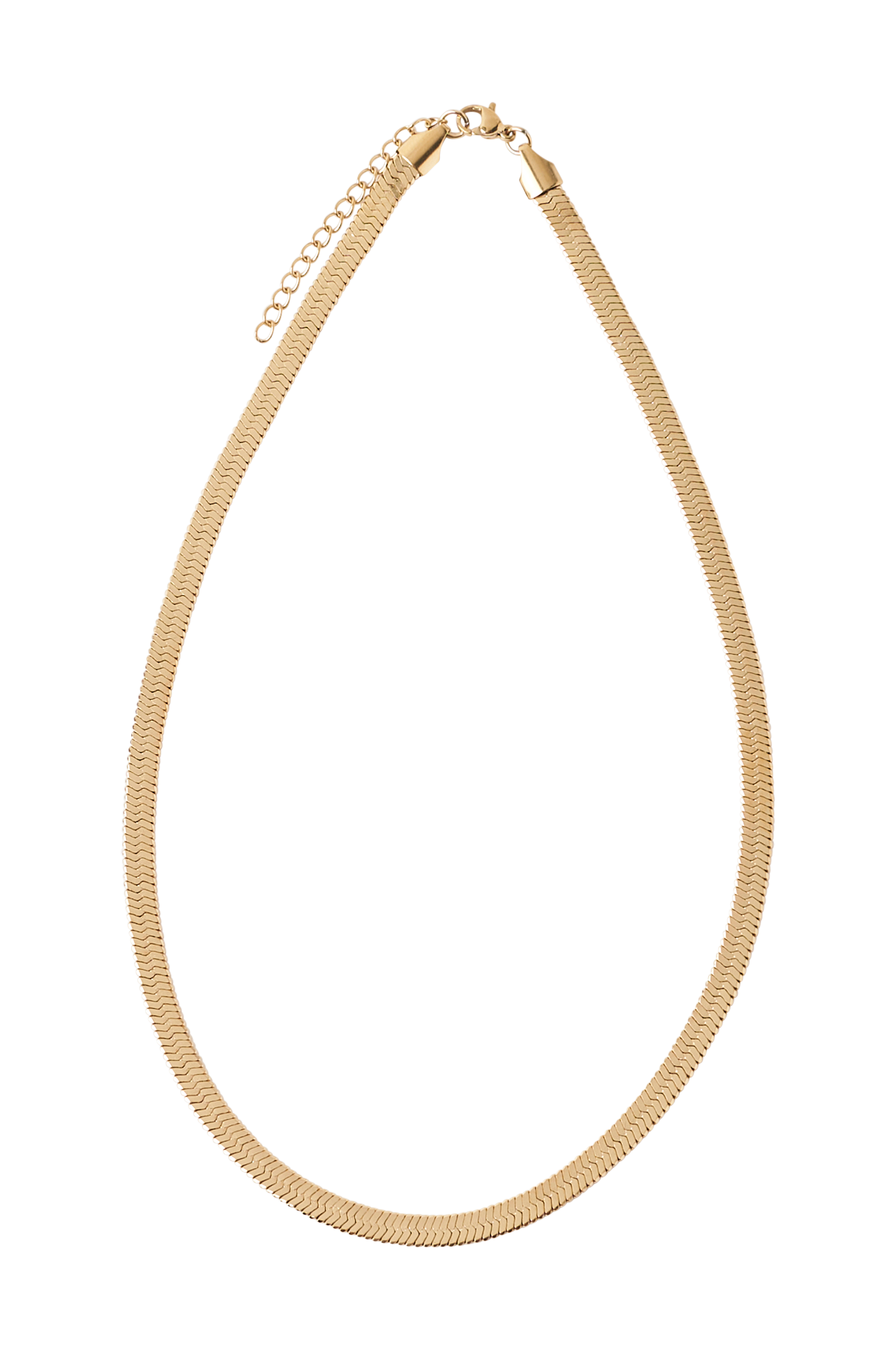 En flad snake-kæde i guldpletteret stål, udsmykket med et lille hjerte længst ude. Perfekt halskæde der kan bæres alene eller kombineres med andre halskæder og bygges op i lag. Længde: 45 cm, justerbar. Nikkeltestet.