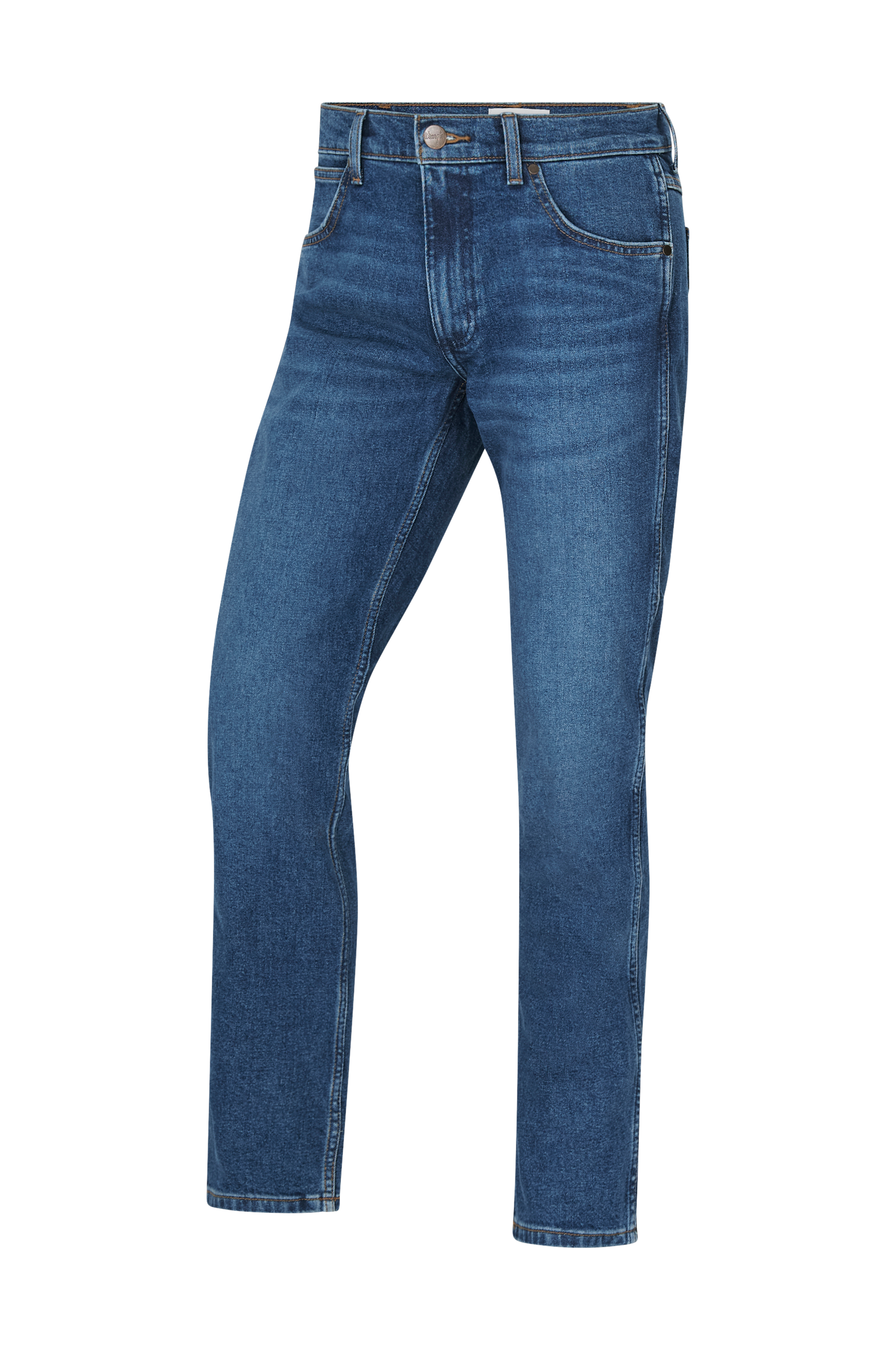 Jeans af stretchdenim med normalhøj talje og lige ben. 5-lommemodel med lynlås i gylpen.