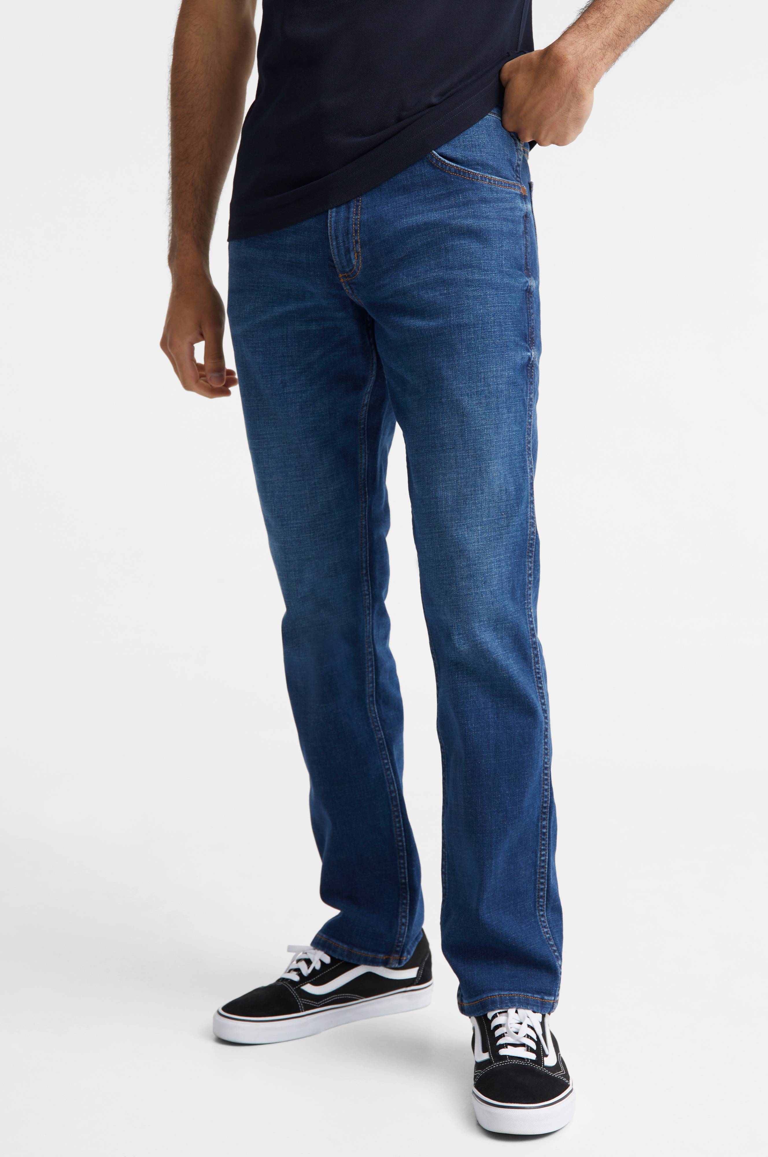 Jeans af stretchdenim med normalhøj talje og lige ben. 5-lommemodel med lynlås i gylpen.
