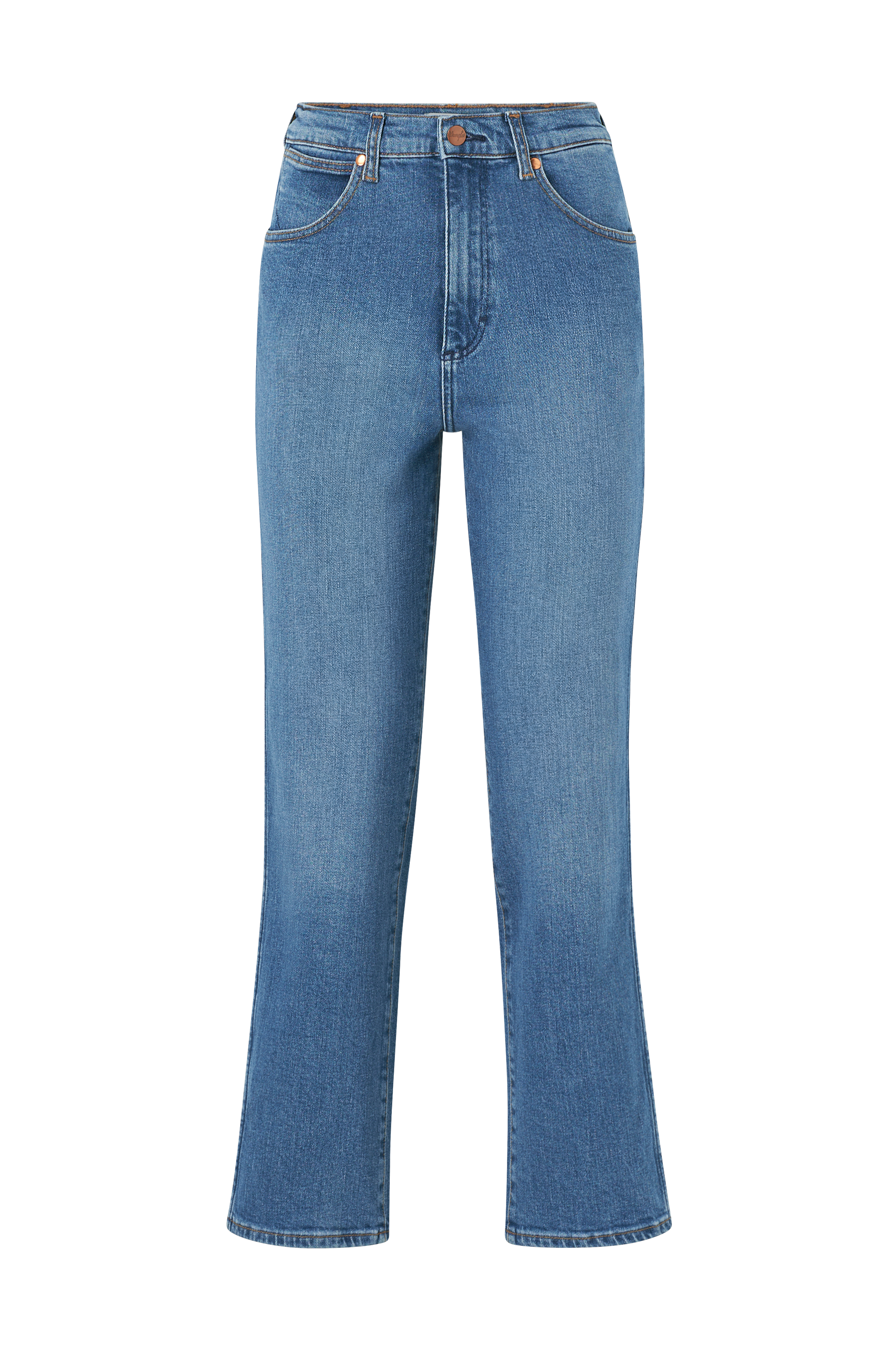 Model med høj talje som har lynlås i gylpen og vide, lige ben. Tre lommer foran og to lommer bagpå.