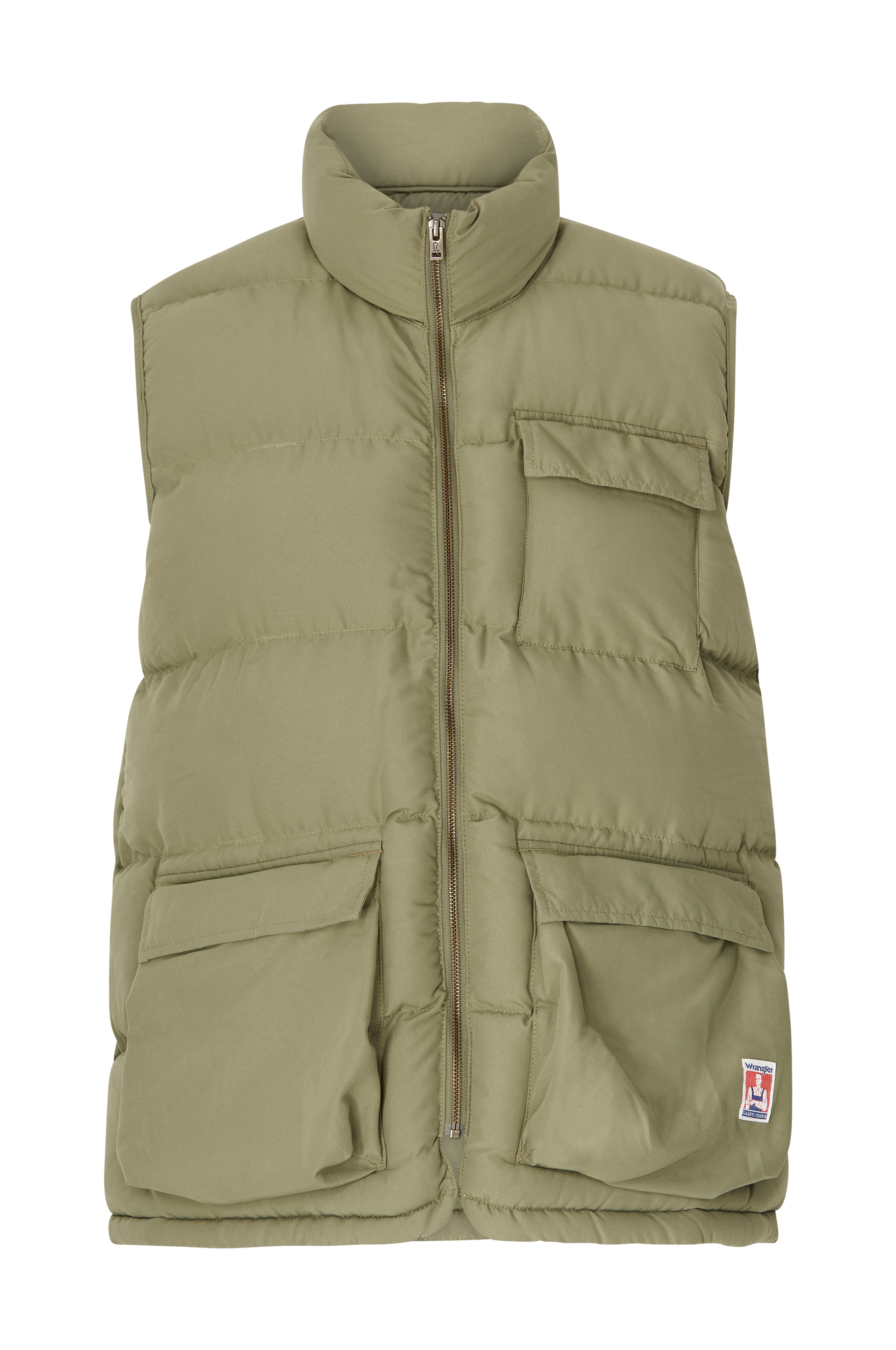 Quiltet og vatteret vest. Høj krave og lynlås. To lommer forneden og en brystlomme, alle med lommeklap og trykknap. Længde ca. 74 cm i str. M.
