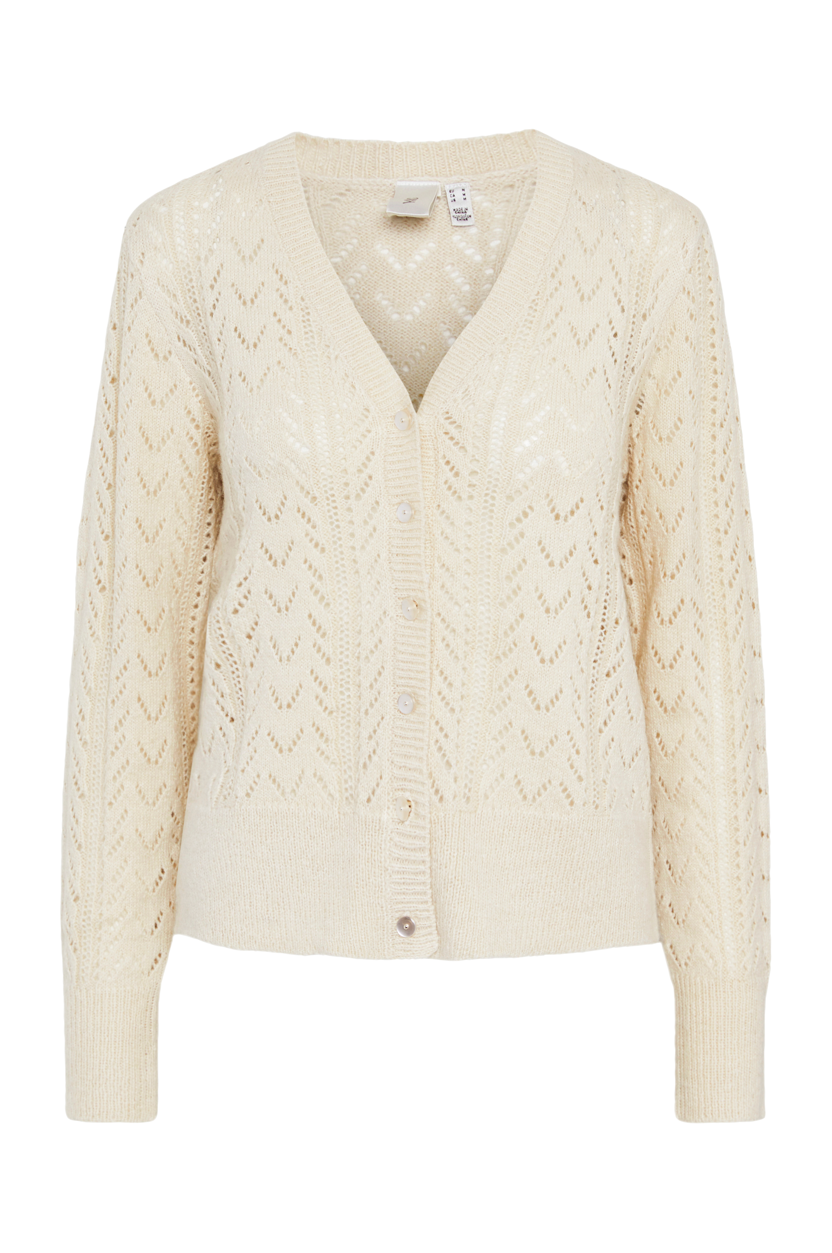 • Mønsterstrikket model• V-udskæring• Knapper foran• Ribstrikkede kanter