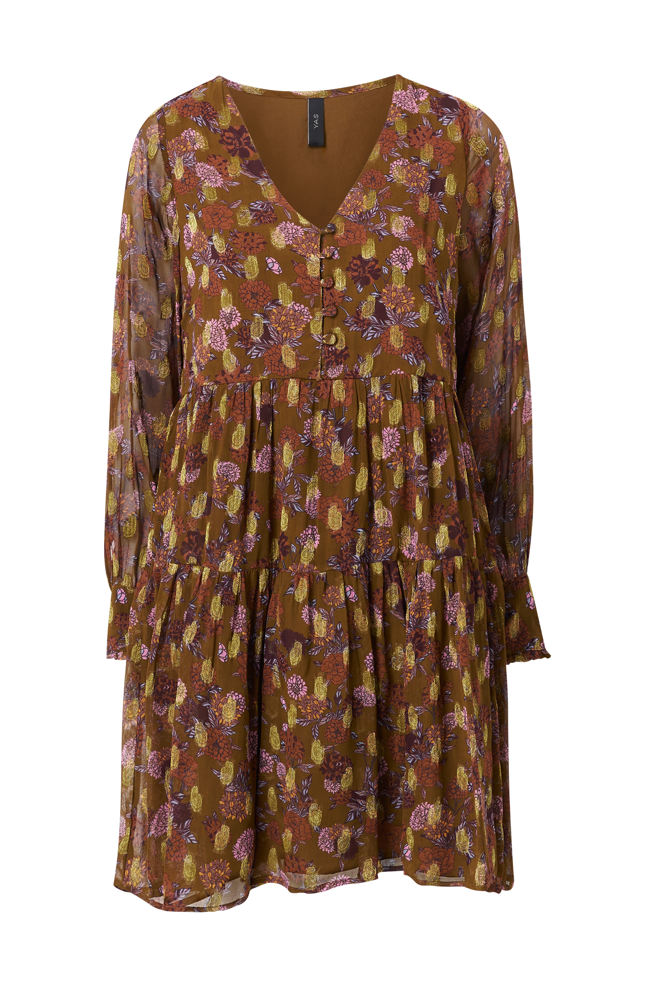 Kjole yasKamille LS Dress fra Y.A.S i chiffon med vævet, guldglitrende mønster. V-udskæring og betrukne knapper foroven foran. Rynket talje og A-formet underdel med flæse. Lange ærmer med manchet og knap i ærmekant. Foret. Længde ca. 93 cm i str. S.