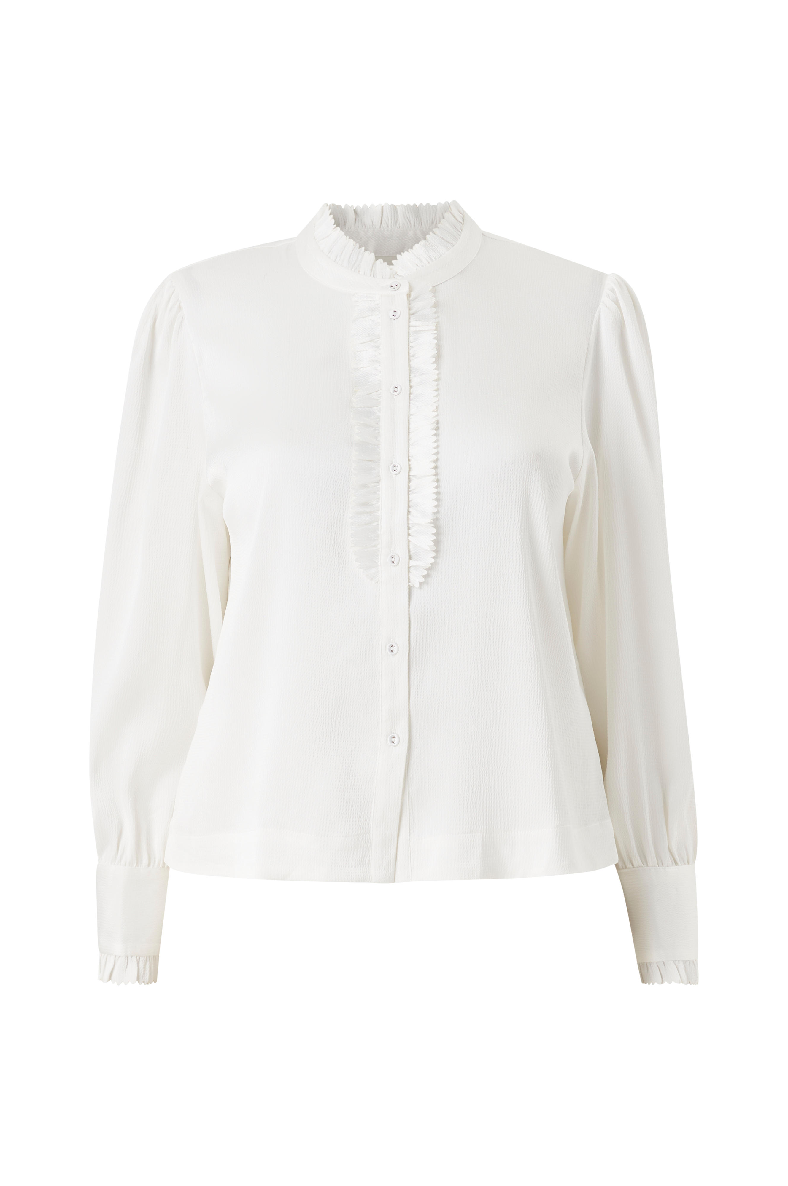 • Skjorte i behandlet satin• Volantdetalje foran og i halsen• Knapper• Ballonærmer med manchet