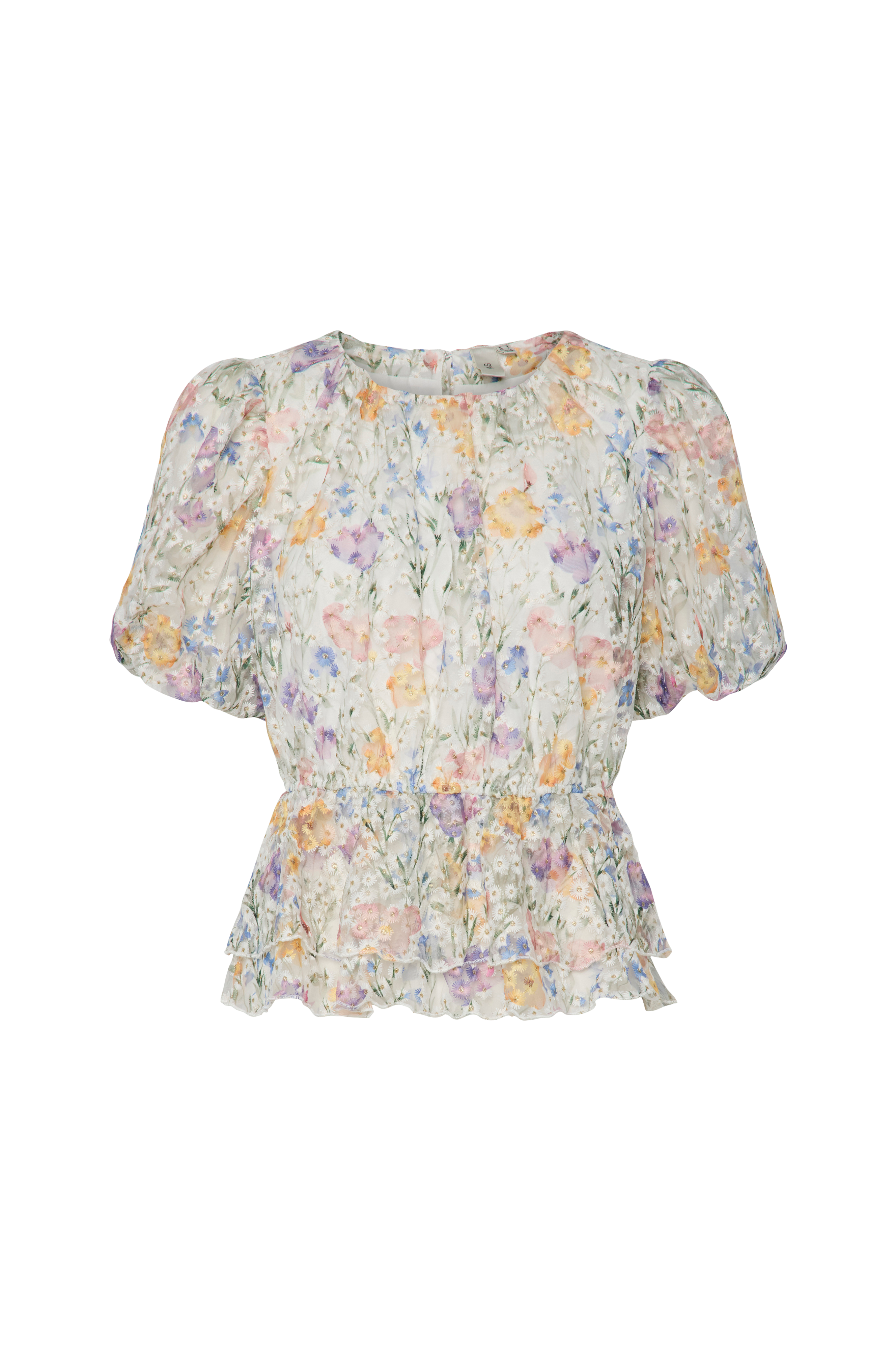• Broderet model i mesh med peplumdesign• Rund hals med samling og knap i nakken• Kort ballonærme• Elastik ved taljen med dobbelte lag nederst• Foret