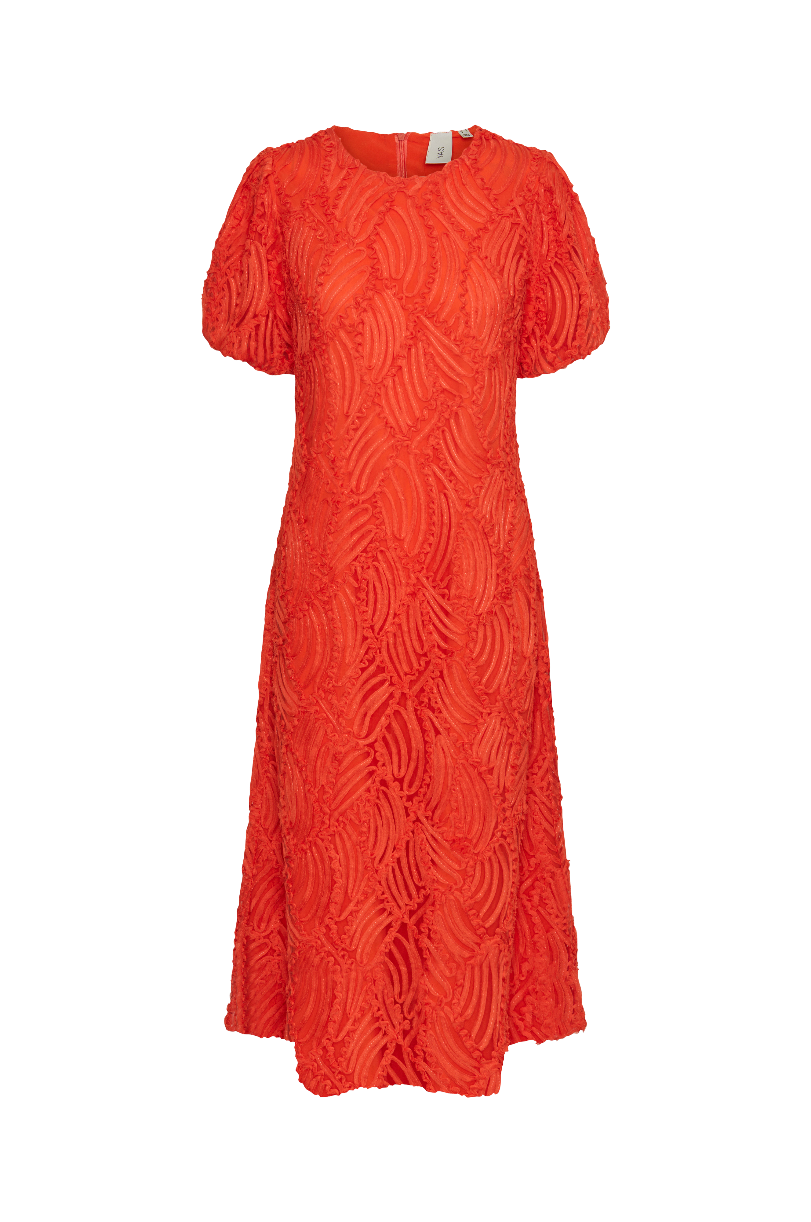 • Lang, figurformede model med strukturmønster overalt• Rund halsudskæring• Kort ballonærme med elastik ved manchetterne• Længde: 127 cm i størrelse S