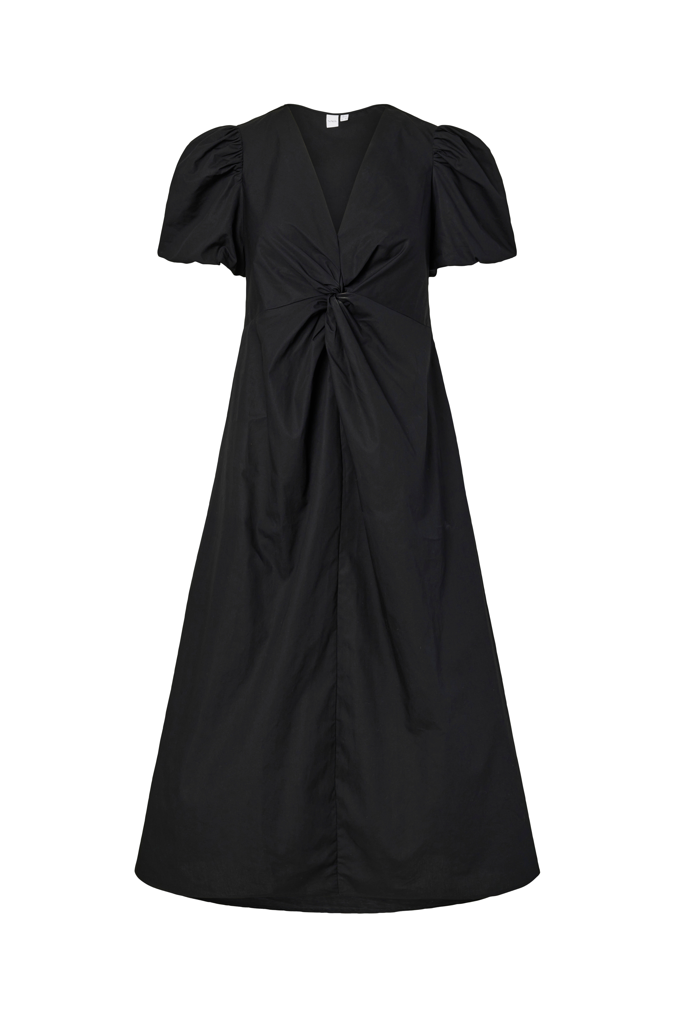 • Midikjole i bomuld• V-udskæring med knudedetalje foran• Korte pufærmer• Skjult lynlås i siden• Indvendig elastik bagpå ved taljen• Længde: 124 cm i størrelse 36