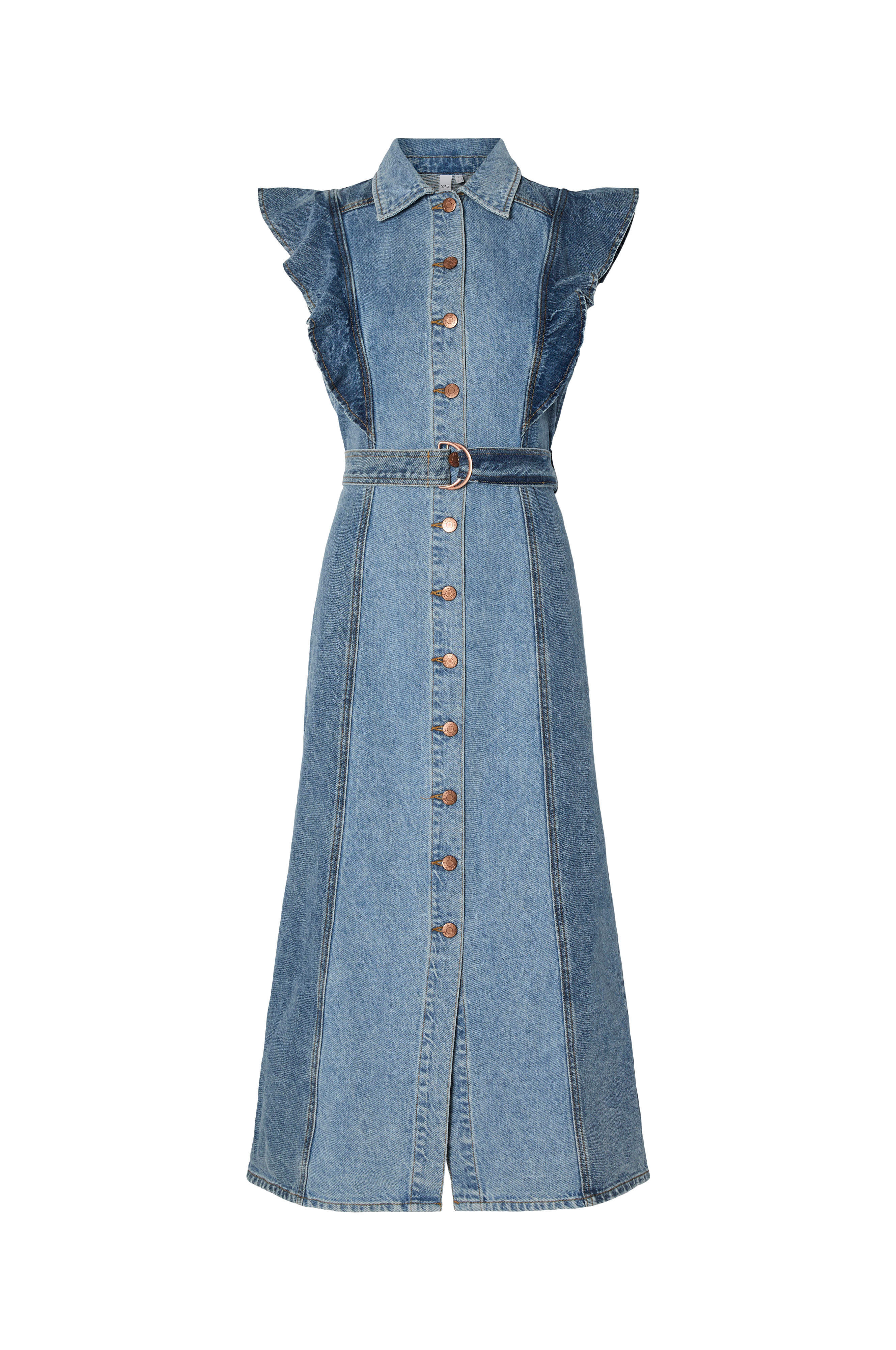 • Lang cowboykjole• Ærmeløst design• Skjortekrave• Volanter over skuldrene• Knapstolpe hele vejen frem• Bælte ved taljen• Normal pasform• Længde: 131 cm i størrelse 36