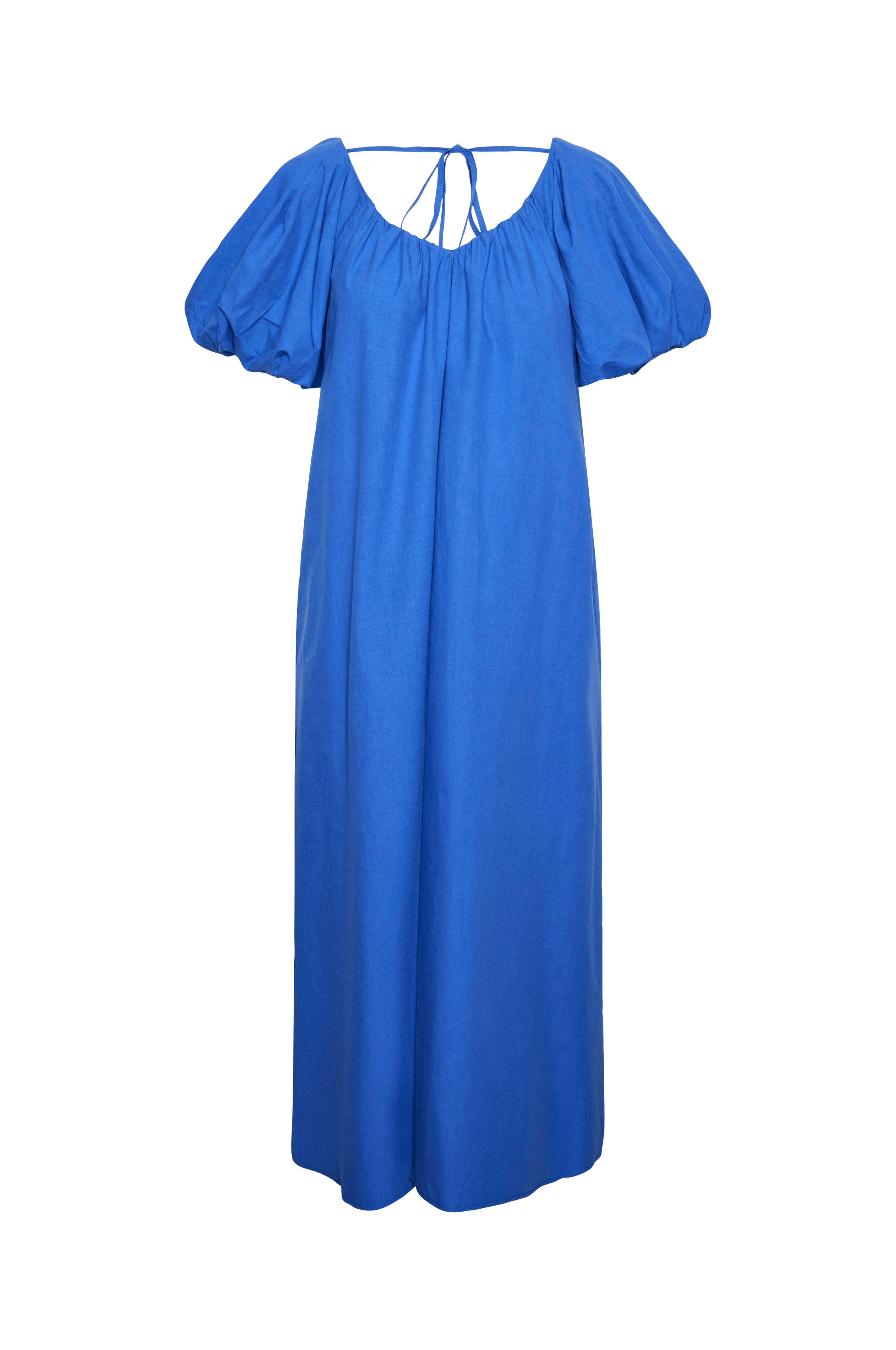 • V-udskæring ved fronten og bagpå• Bindebånd oppe bagved• Korte ballonærmer med elastik ved manchetterne• Sidelommer• Slids bagpå• Vævet for• Længde: 131 cm i størrelse S