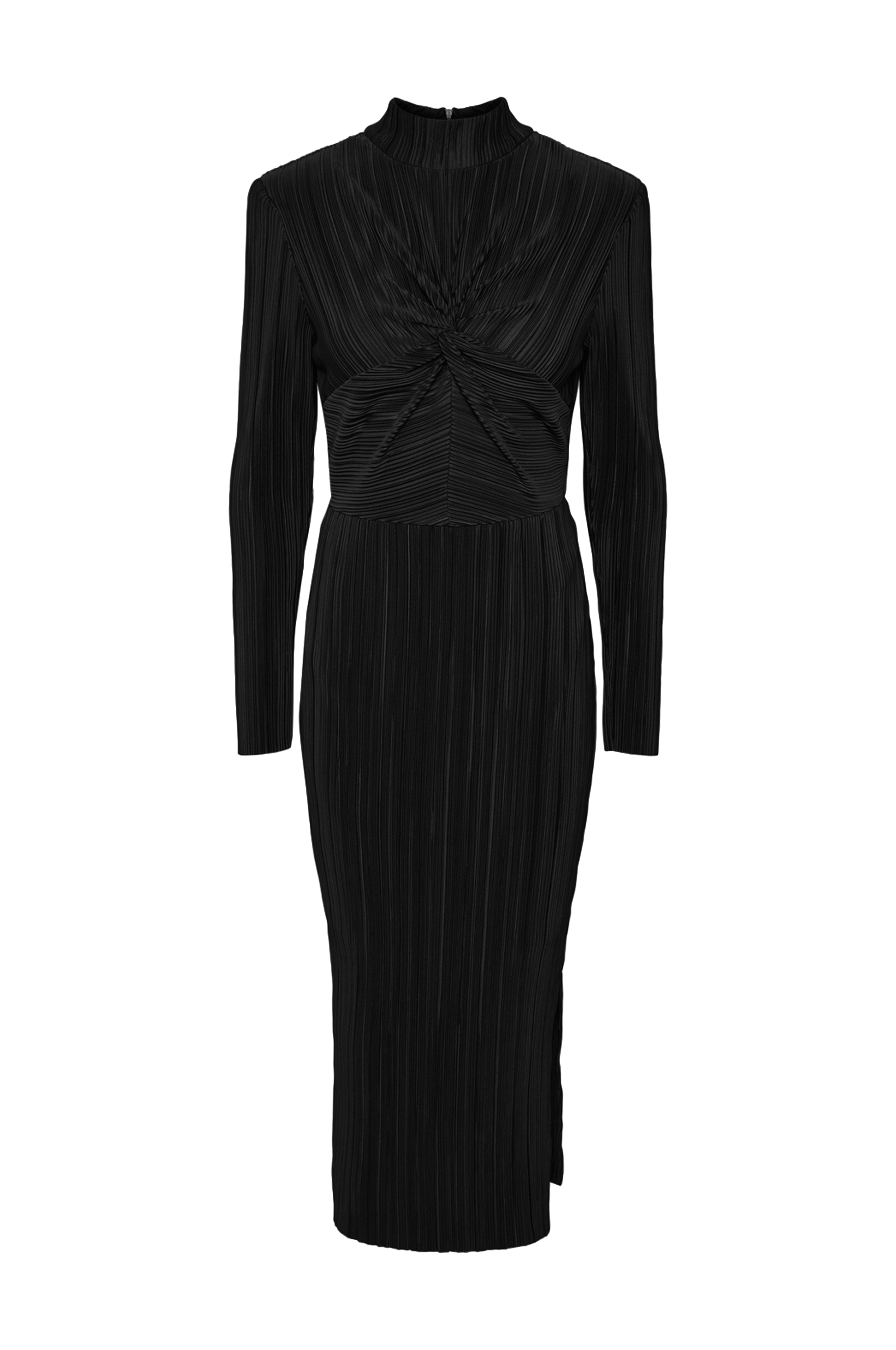 • Plisseret maxi kjole• Rund, høj halsudskæring med lynlås bagpå• Forede skuldre• Drapering foran med knudedetalje• Lange ærmer• Elastisk udskæring ved taljen• Længde: 132 cm i størrelse S
