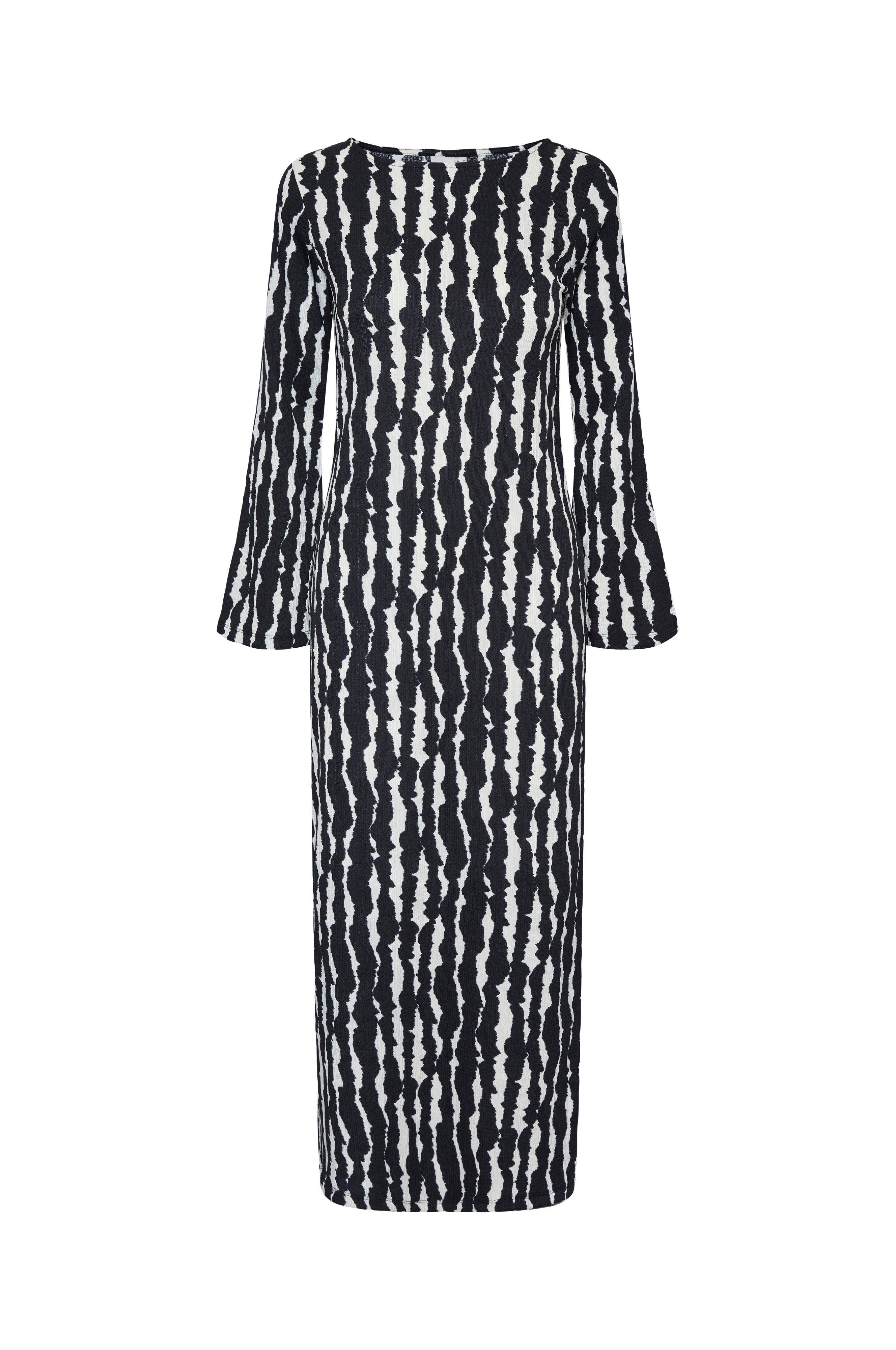 • Lang, mønstret model• Bred halsudskæring• Langt ærme med svaj• Længde: 137 cm i størrelse S