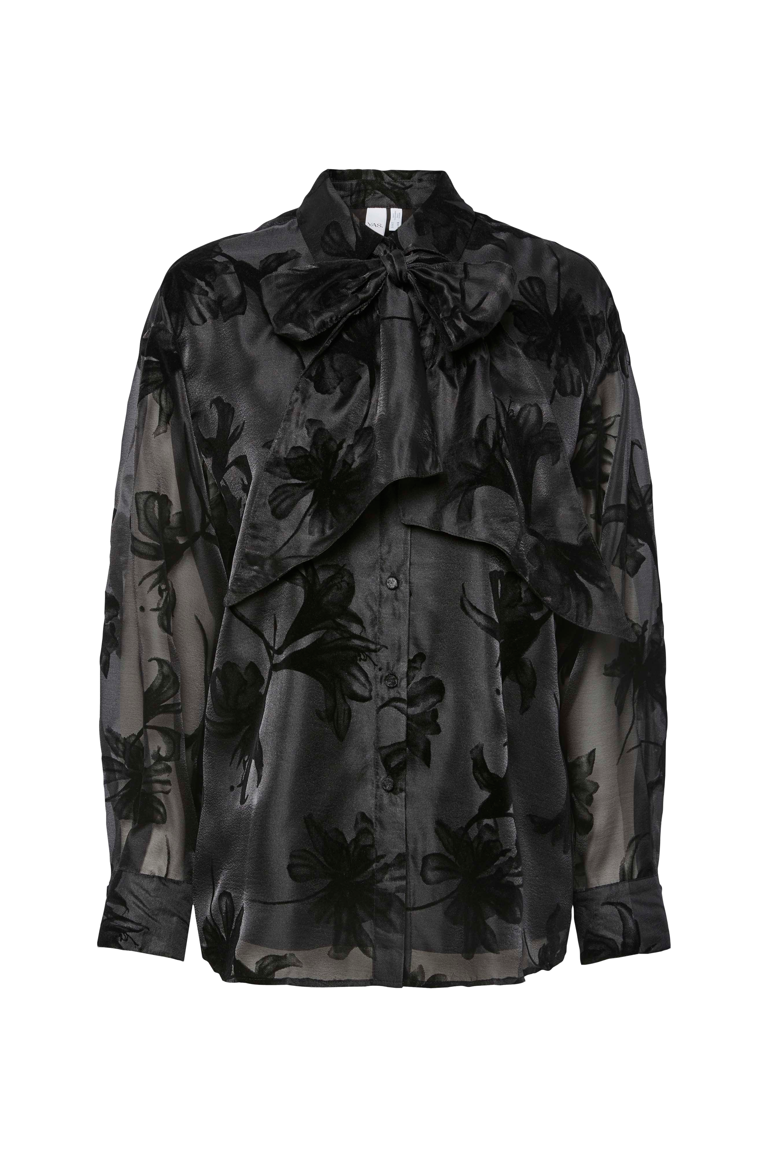 • Foret skjorte i organza med mønster i velour• Beklædte knapper foran• Aftagelig knudedetalje rundt om halsen• Lange, uforede ærmer med manchetter ved manchetterne• Afrundet søm