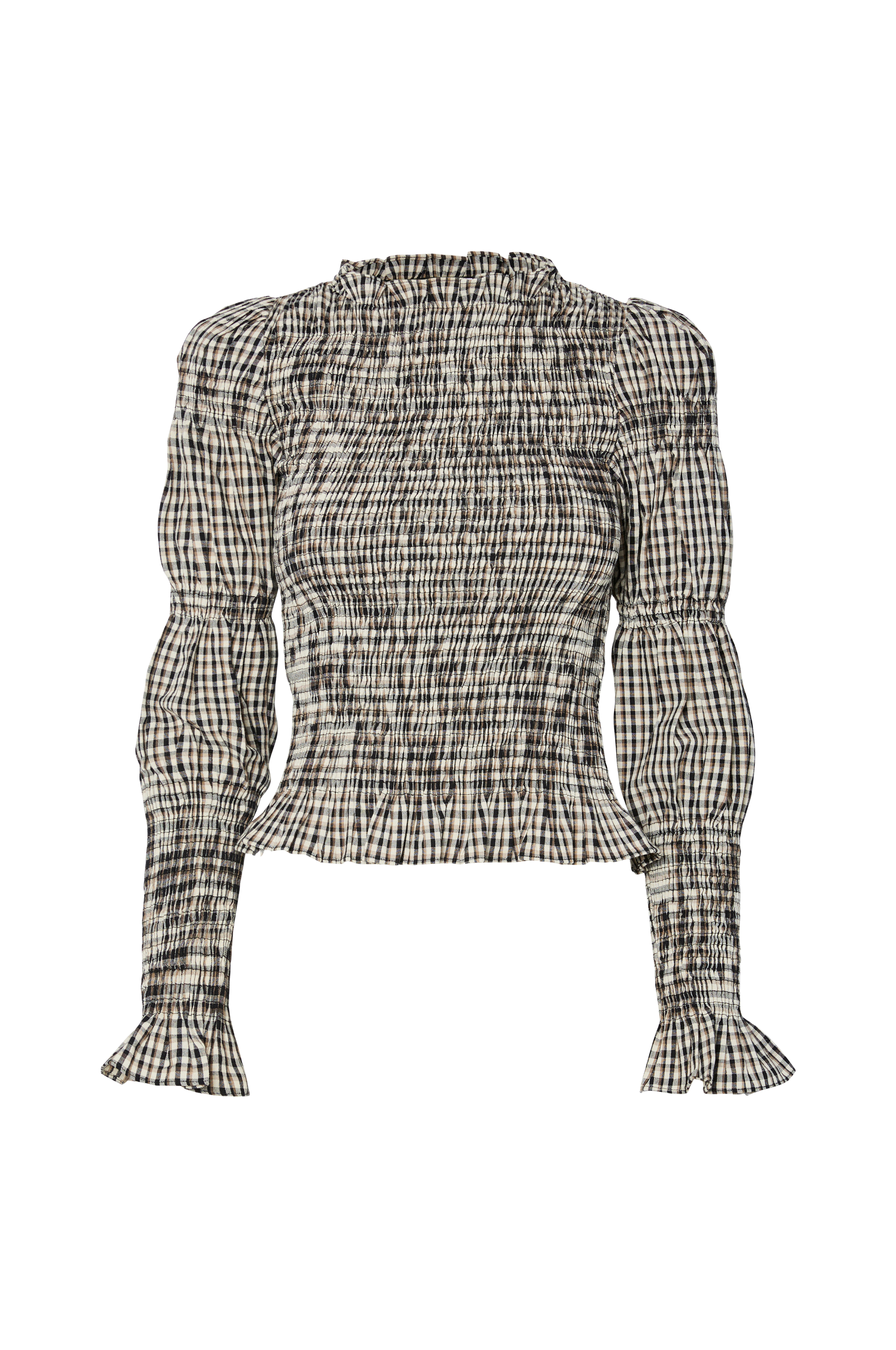 • Smocket, figursyet top med flæsekrave• Struttende, lange ærmer med smockdetaljer