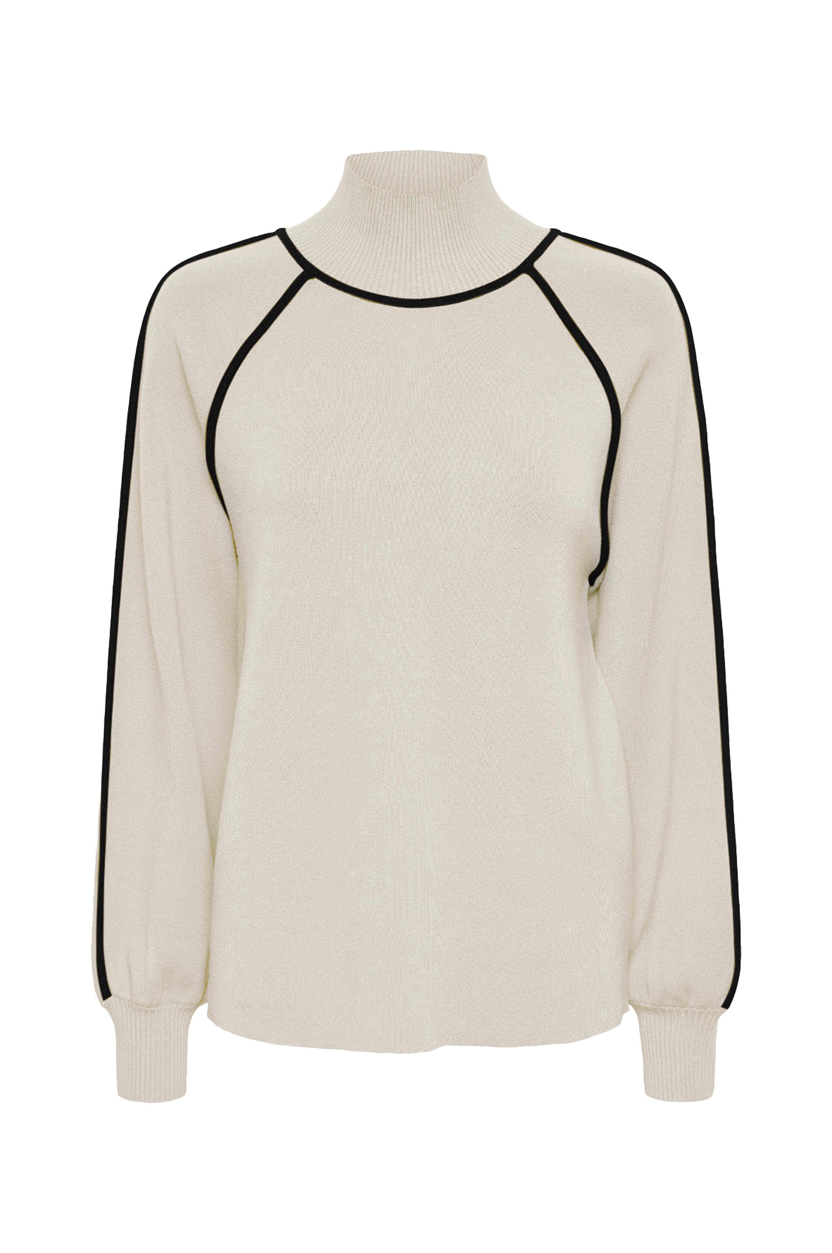 • Fintstrikket trøje med høj, ribstrikket krave• Ribstrik ved manchetterne og nederst• Noget bredere sømdetalje ved fronten, bagpå, rundt om halsen og på ærmerne