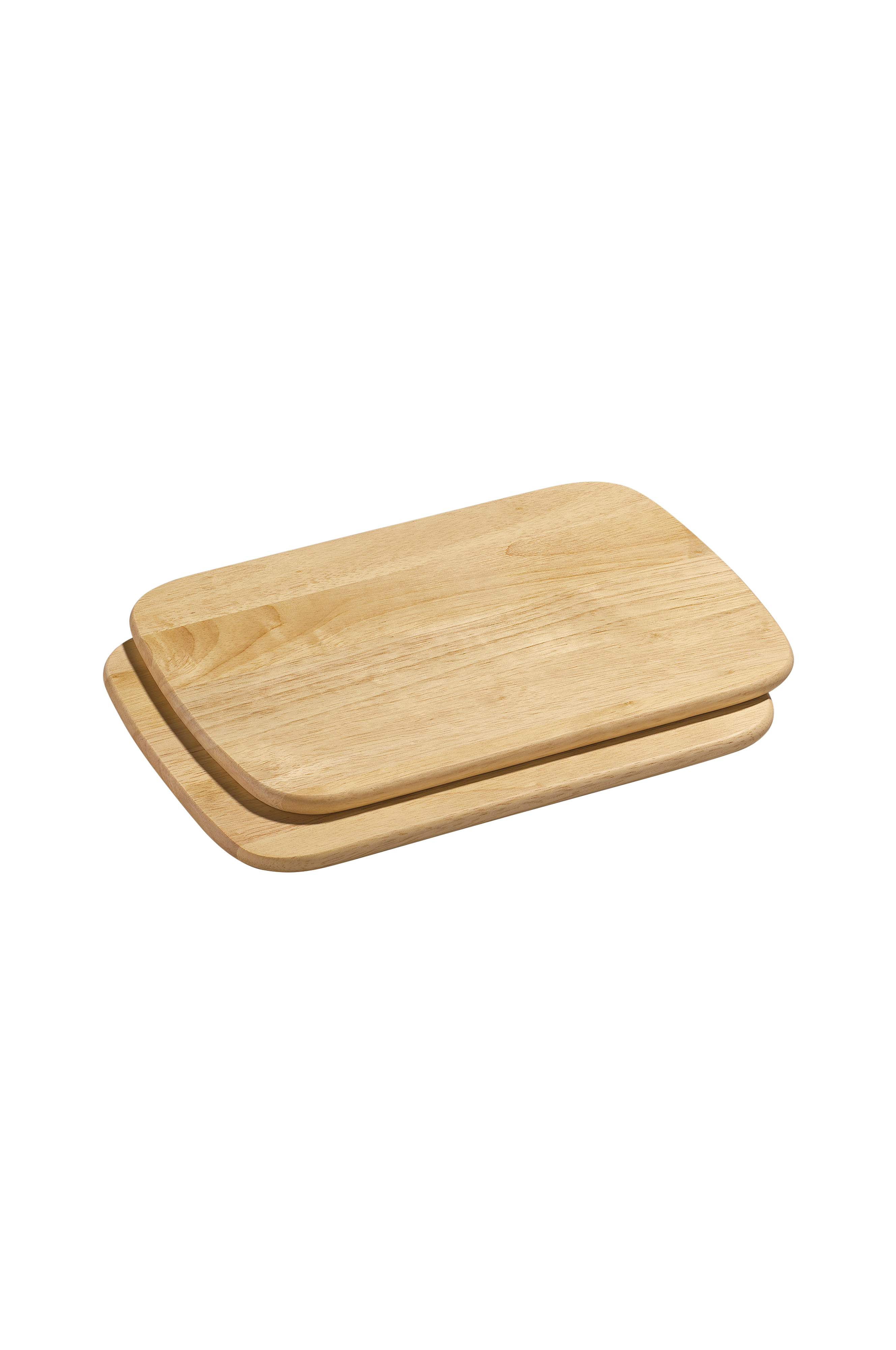 2 skærebrætter i en pæn model, der også passer perfekt som serveringsbakker eller morgenmadsbakker. Af gummitræ.