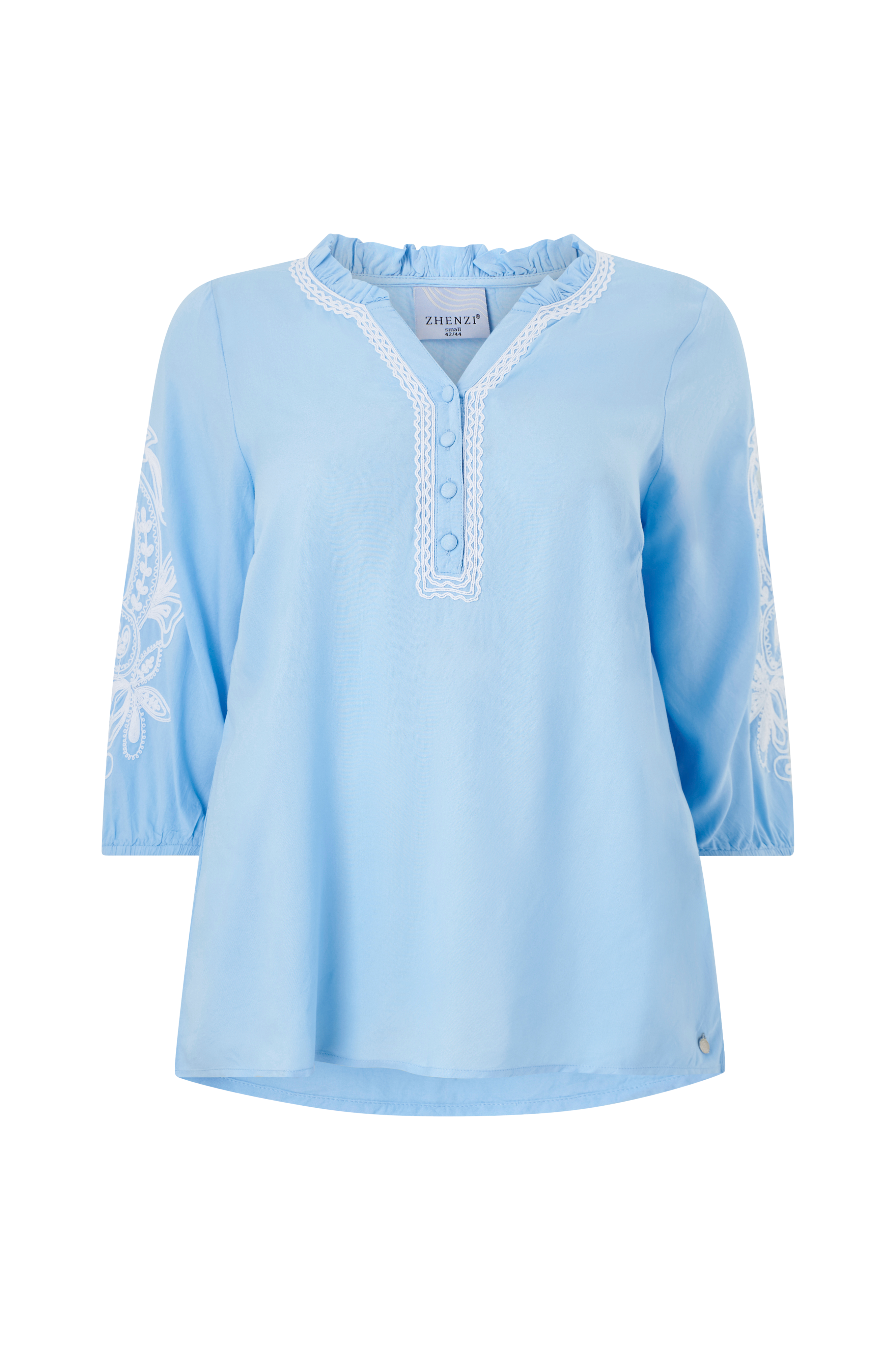 • Bluse i blød viskose med broderet mønster foran og på ærmerne • 3/4 lange ærmer med elastik ved manchetterne • V-formet halsudskæring med flæsekant • Kort knapstolpe foran med beklædte knapper • Søm med bølgeformet effekt i ryggen • Indsnit ved brystet • Store størrelser