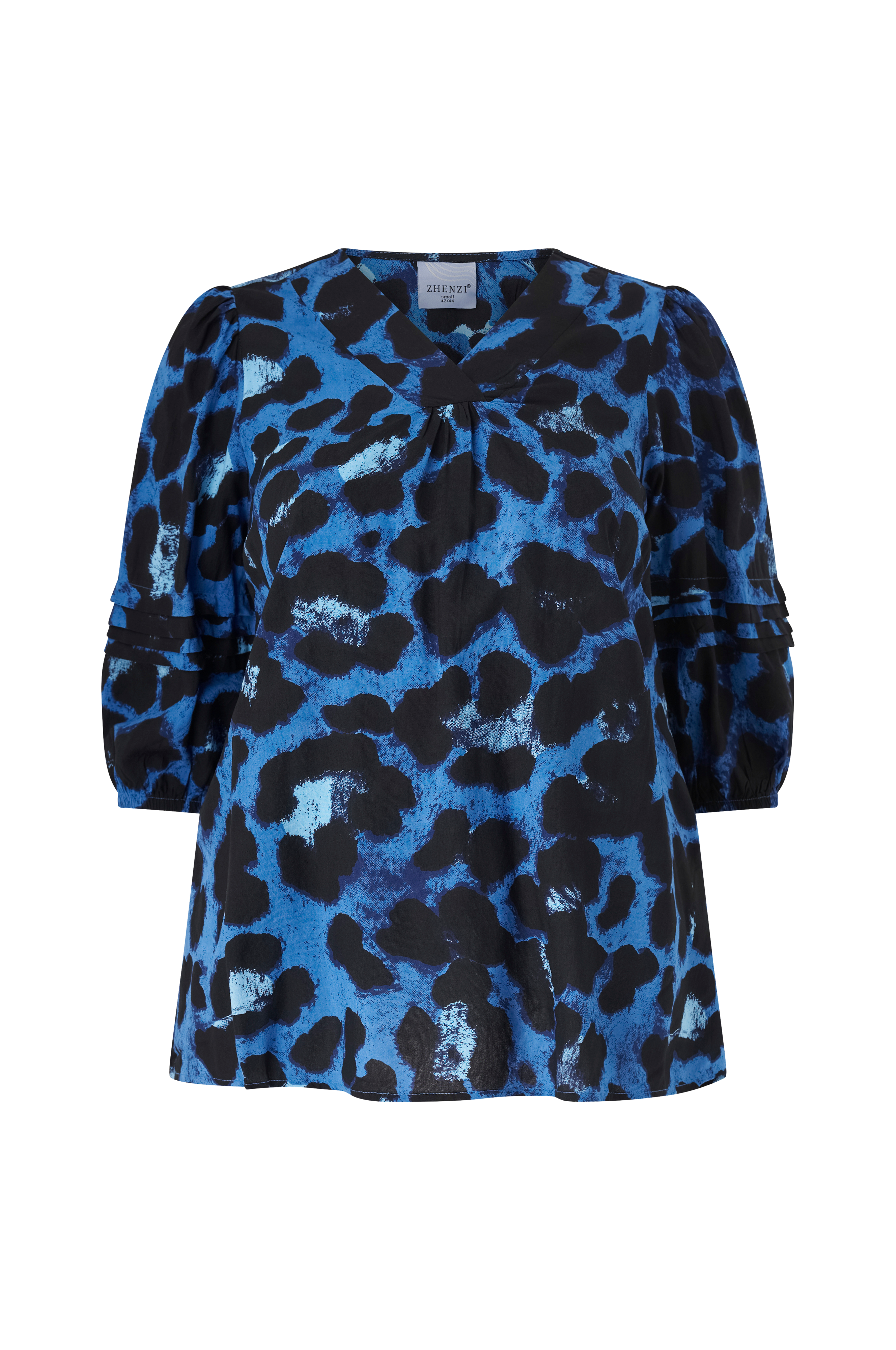 • Model med svaj• V-formet halsudskæring med samling på brystet• 3/4 langt ballonærme med syede folder og elastik ved manchetterne