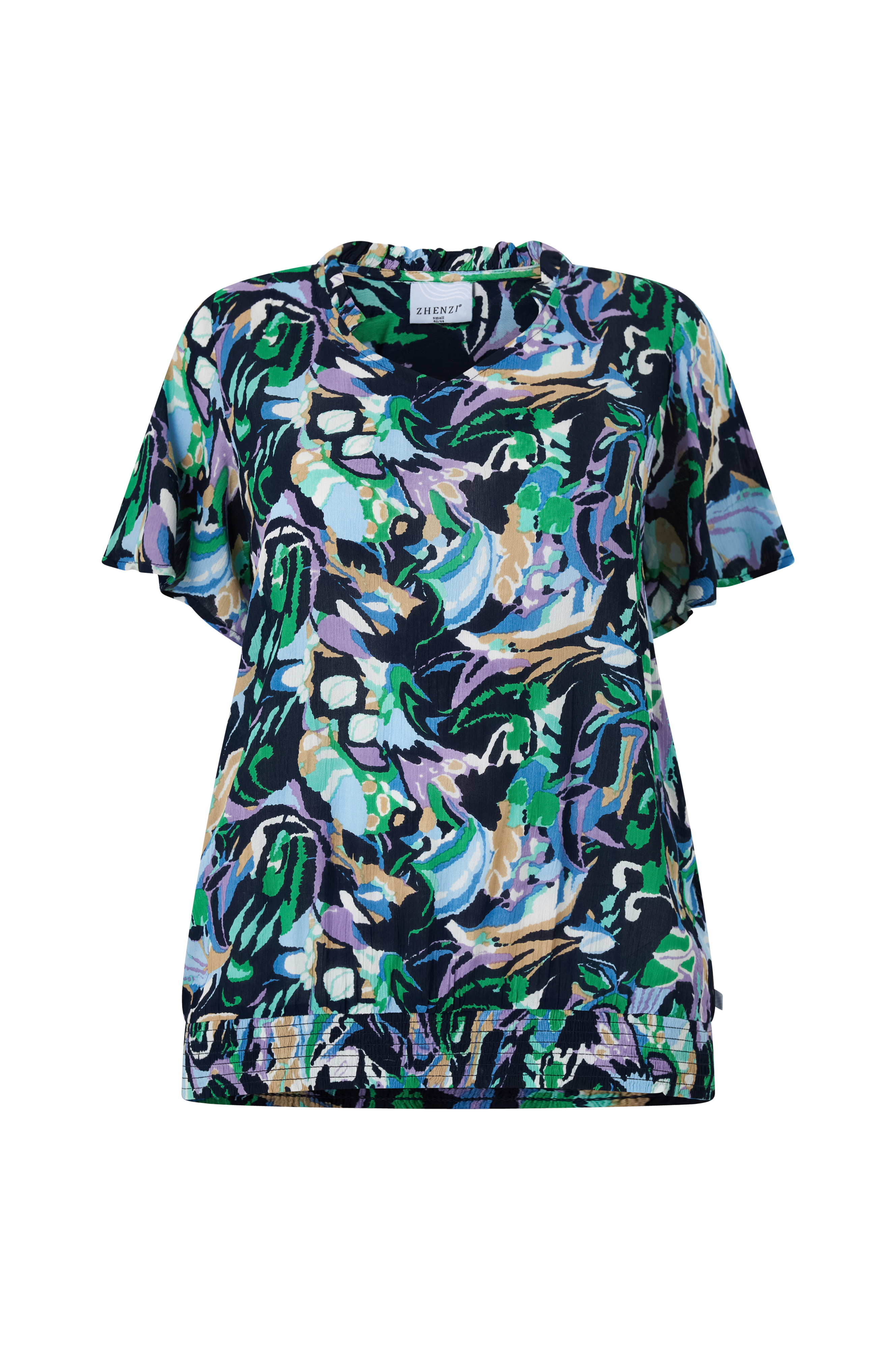 • Bluse i viskose• V-formet halsudskæring med flæsekant bagpå• Korte trompetærmer• Smocket søm• Store størrelser