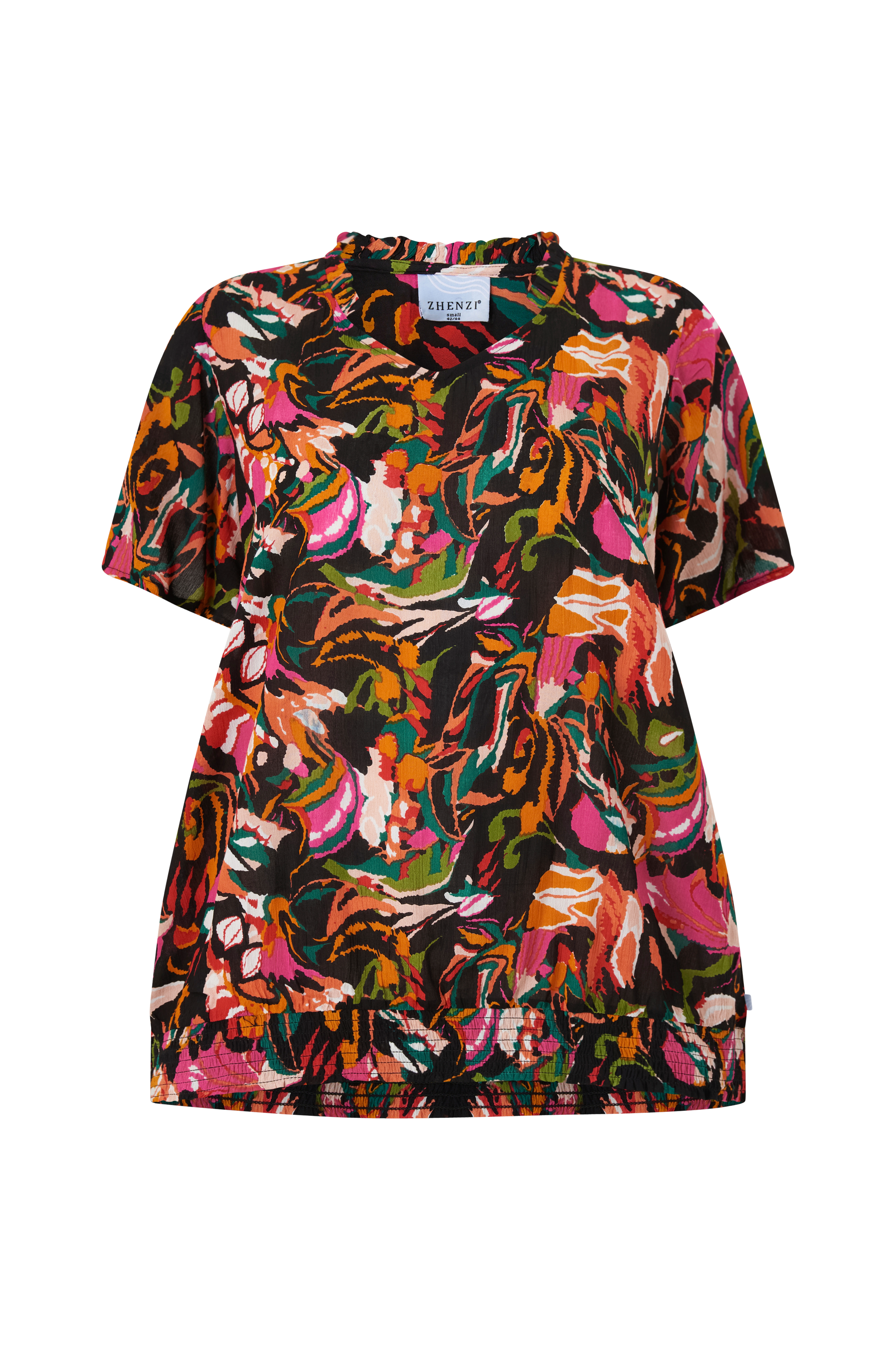 • Bluse i viskose• V-formet halsudskæring med flæsekant bagpå• Korte trompetærmer• Smocket søm• Store størrelser