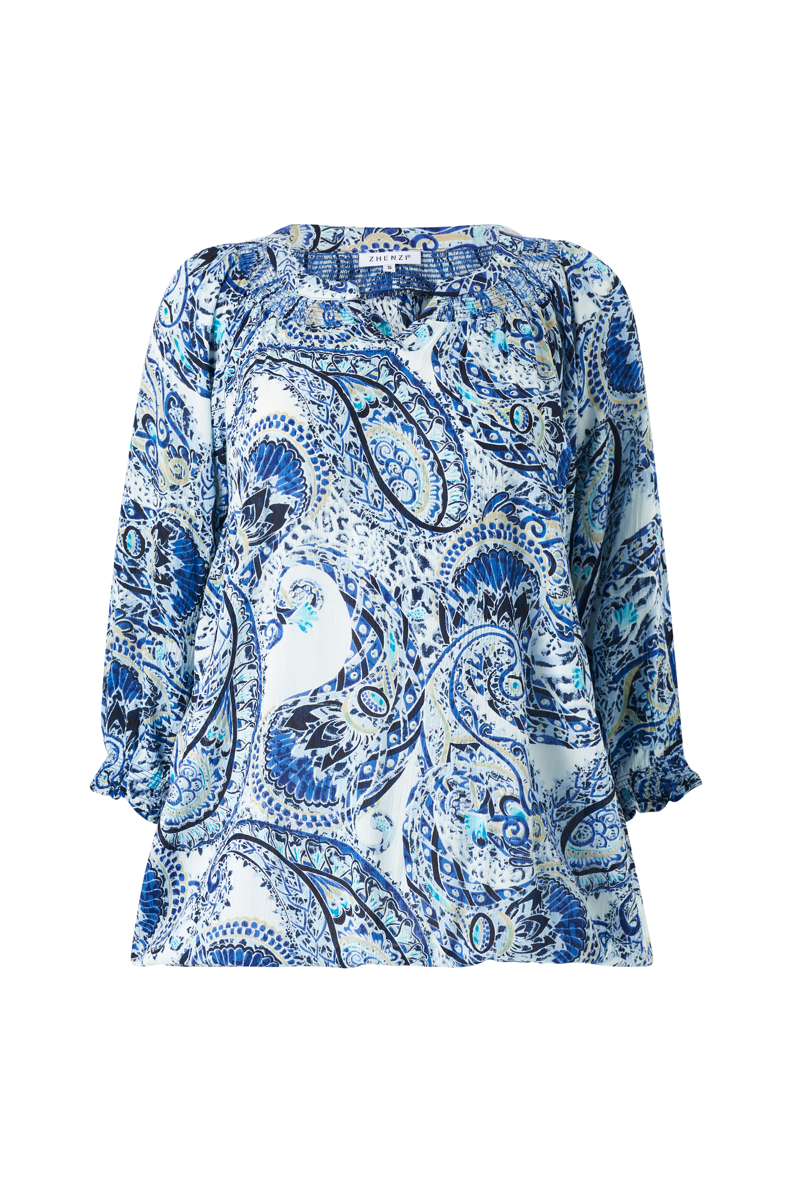 • Mønstret bluse i viskose• V-udskæring• Smockdetalje i halsen• Brede ærmer med smock ved manchetterne• Elastisk bånd ved nederste kant• Store størrelser