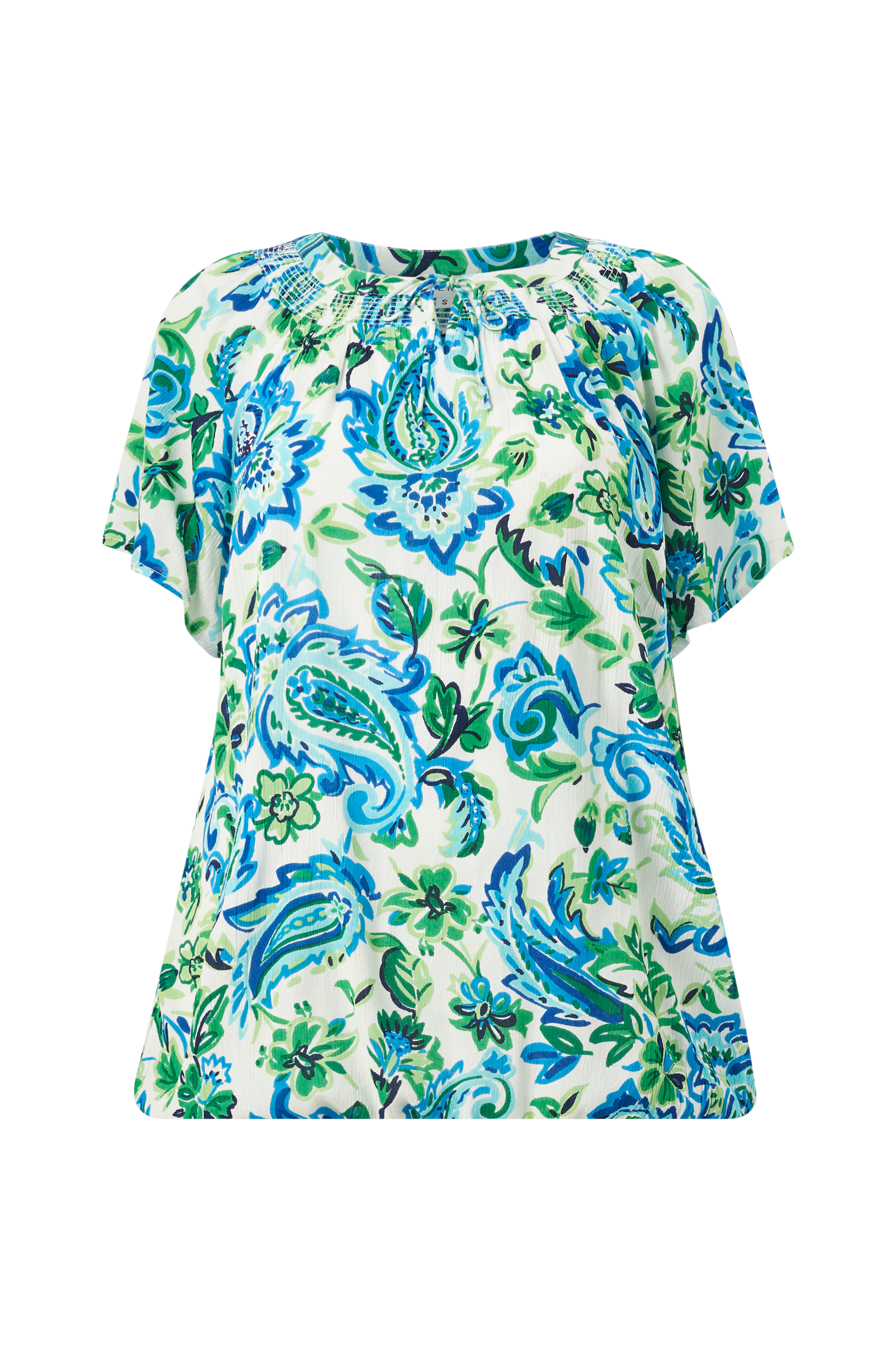 • Rund hals med smock• Ventilation med bindebånd foran• Korte, brede ærmer• Elastik ved nederste kant• Rynket kvalitet• Store størrelser