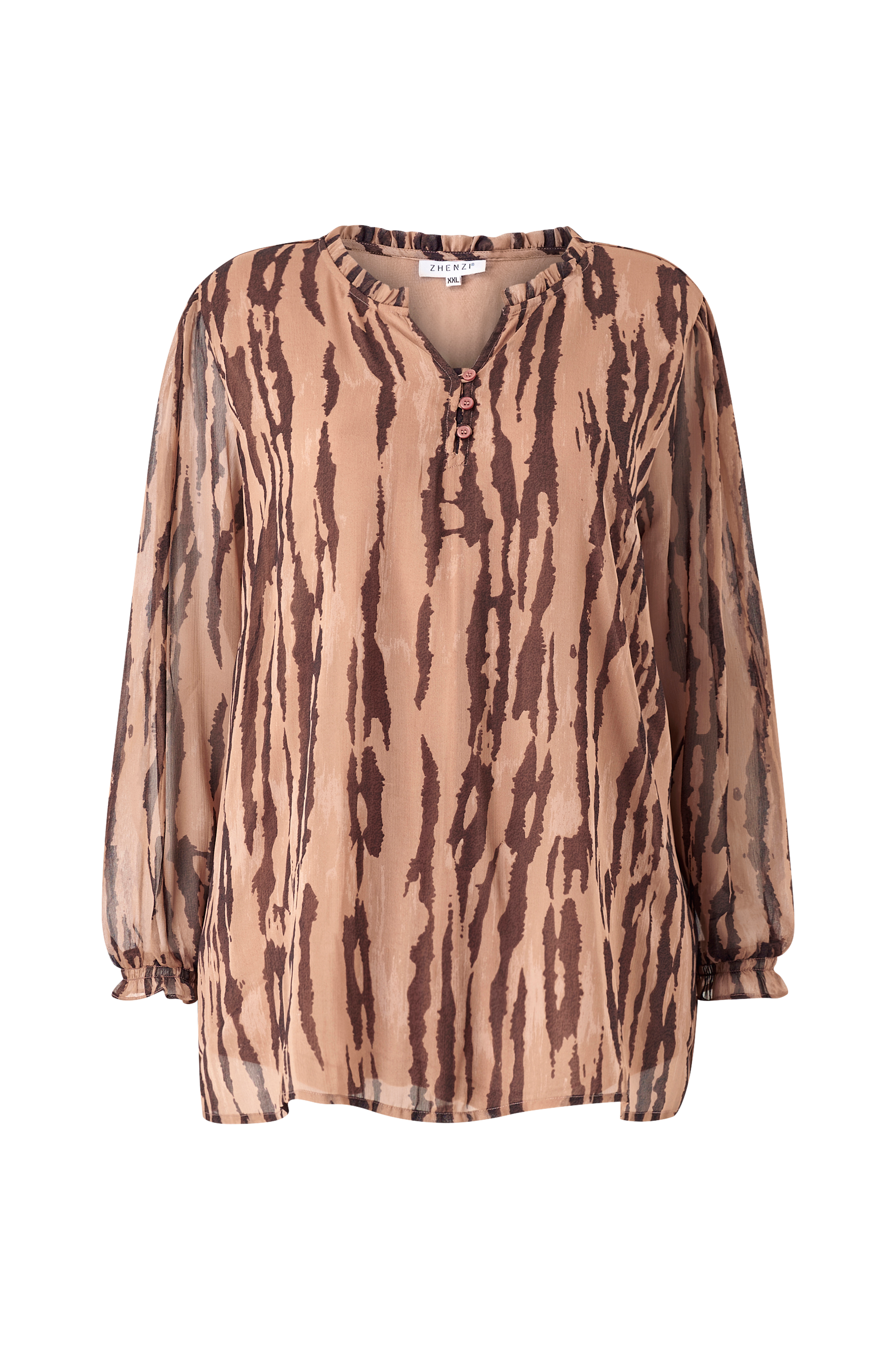 • Bluse i chiffon• Længere model• V-udskæring med volant og knapper foran• Transparente ballonærmer med volant ved manchetterne• Trikotfor• Store størrelser