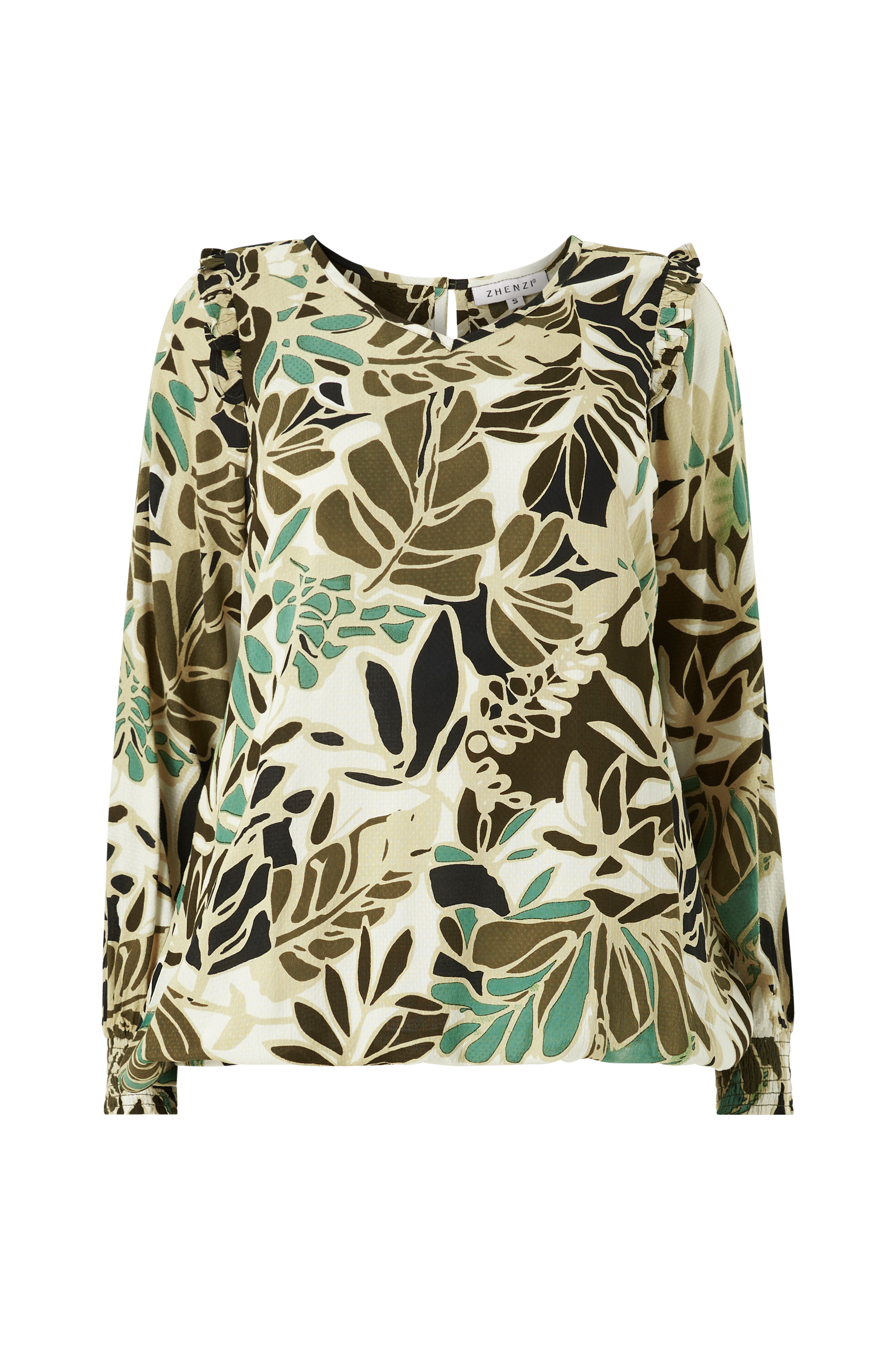• Mønstret bluse i viskose• V-udskæring• Volanter på skuldrene• Ventilation med knap i nakken• Elastisk smock ved manchetterne• Elastisk søm• Store størrelser