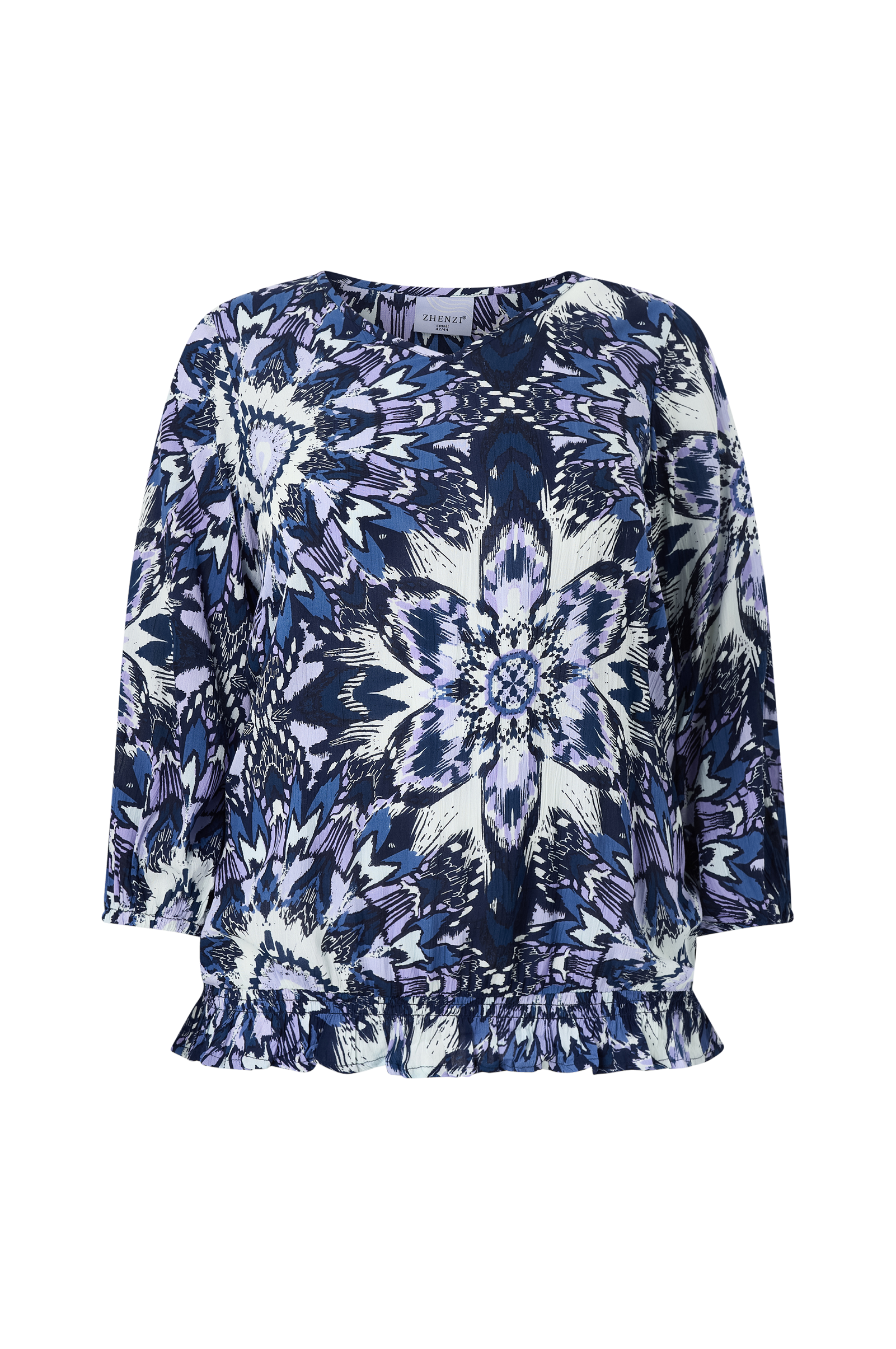 • Tynd bluse i let krøllet materiale• V-formet halsudskæring• 3/4 lange ærmer med elastiske ærmeafslutninger• Smock med volant ved nederste kant• Plusstørrelser