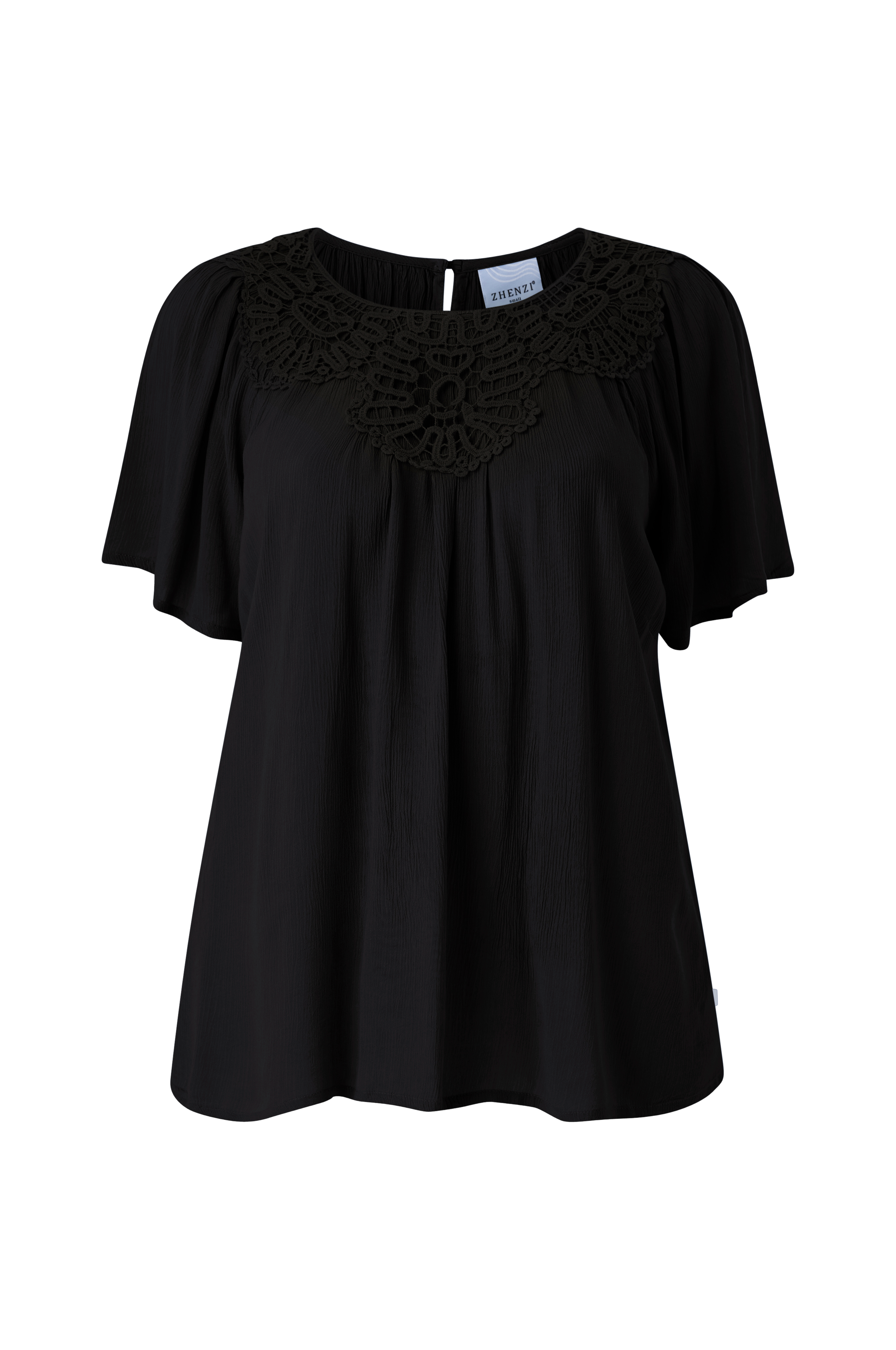 • Bluse i luftig viskose• Rund halsudskæring med påsyet blonde• Nøglehulsåbning med knap i nakken• Brede, korte ærmer• Store størrelser