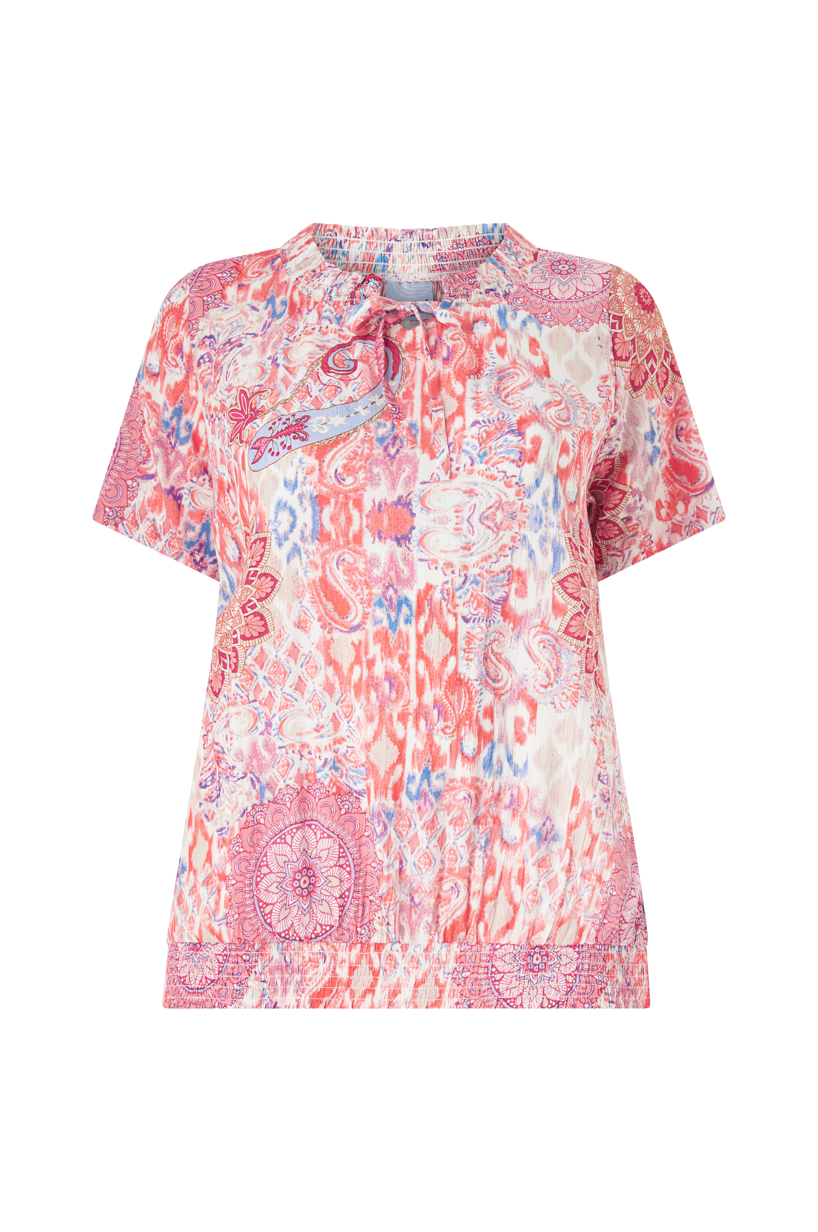 • Store størrelser• Lige model• Rund hals med smock og bindebånd foran• Kort ærme• Smock ved nederste kant
