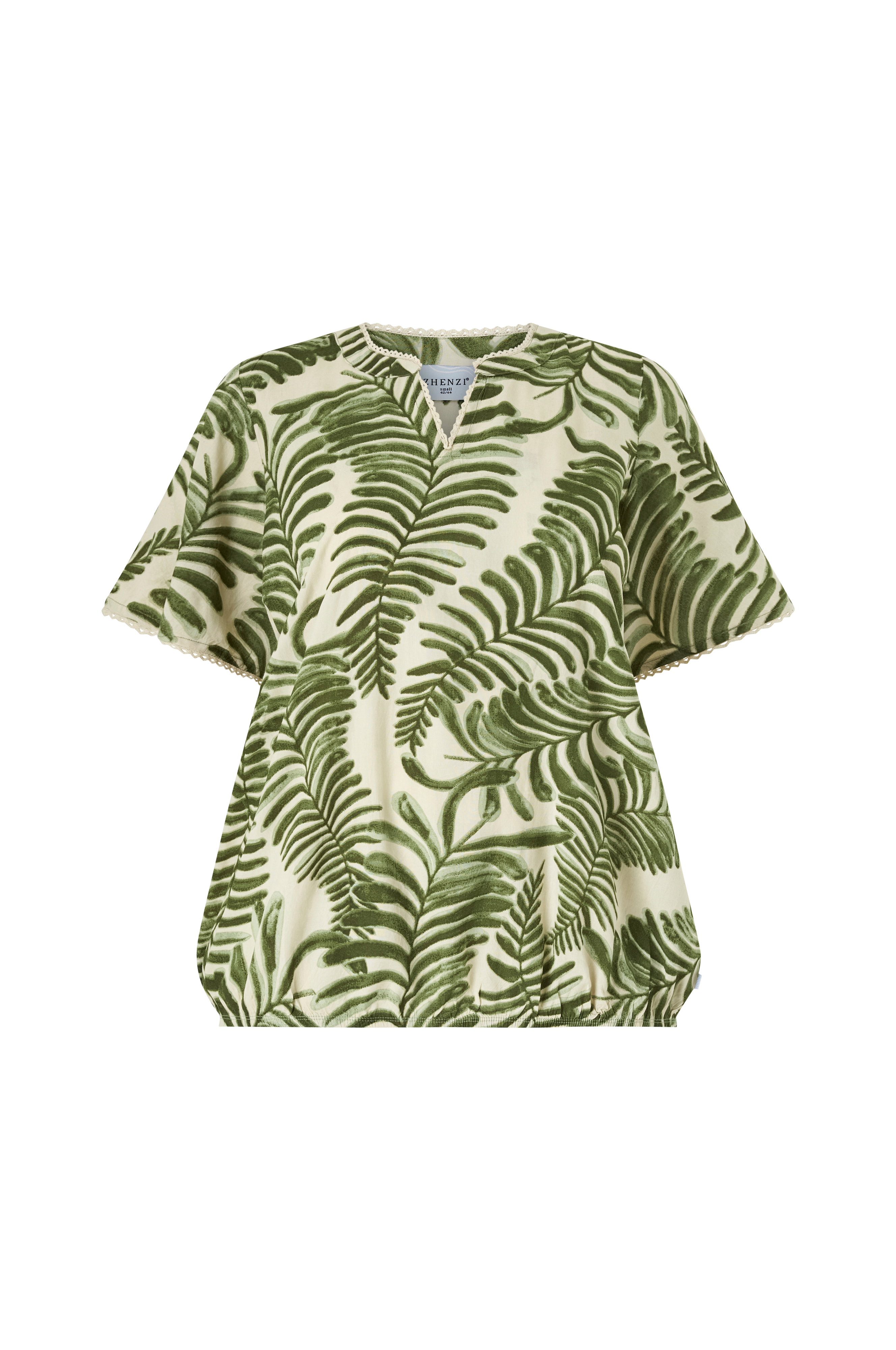 • Mønstret bluse i viskose• Afslappet pasform• Rund halsudskæring med ventilation foran• Korte ærmer• Blonde langs udskæringen og ved manchetterne• Elastik ved nederste kant• Store størrelser