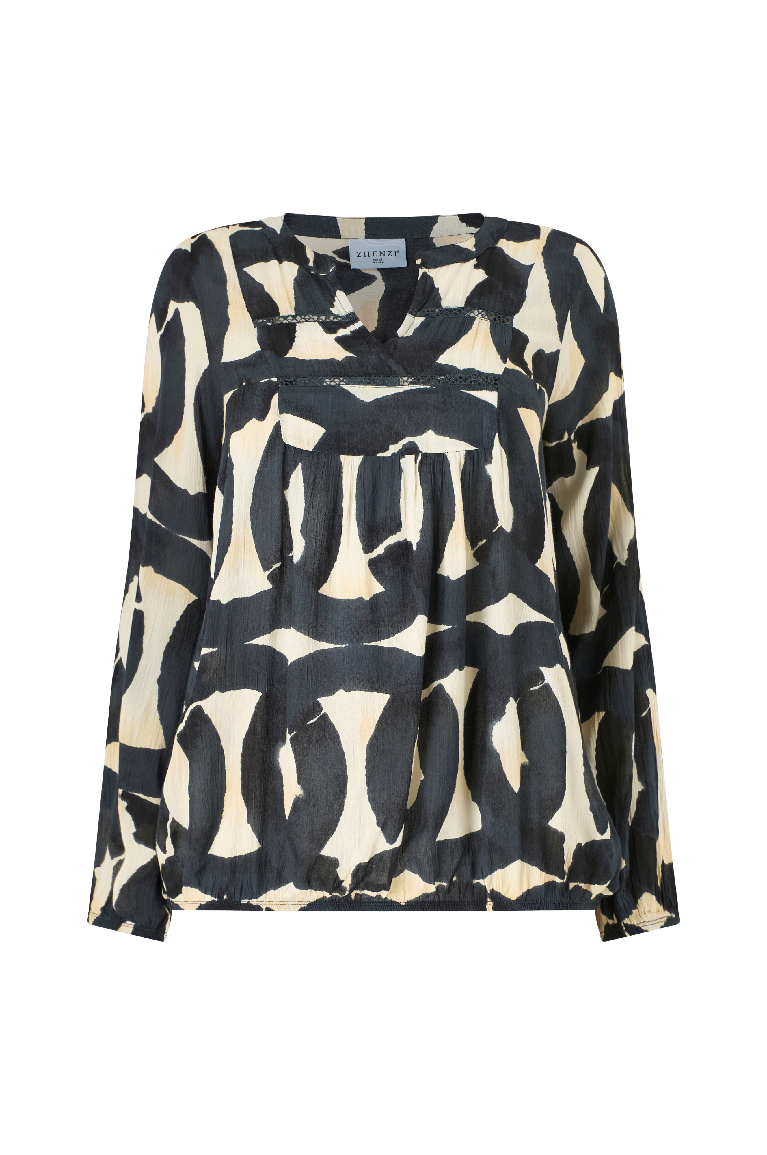• Mønstret, semitransparent bluse i viskose• Lange, brede ærmer med elastik ved manchetterne• Dekorativ blonde oppe foran• Elastik ved nederste kant• Afslappet pasform• Plusstørrelser