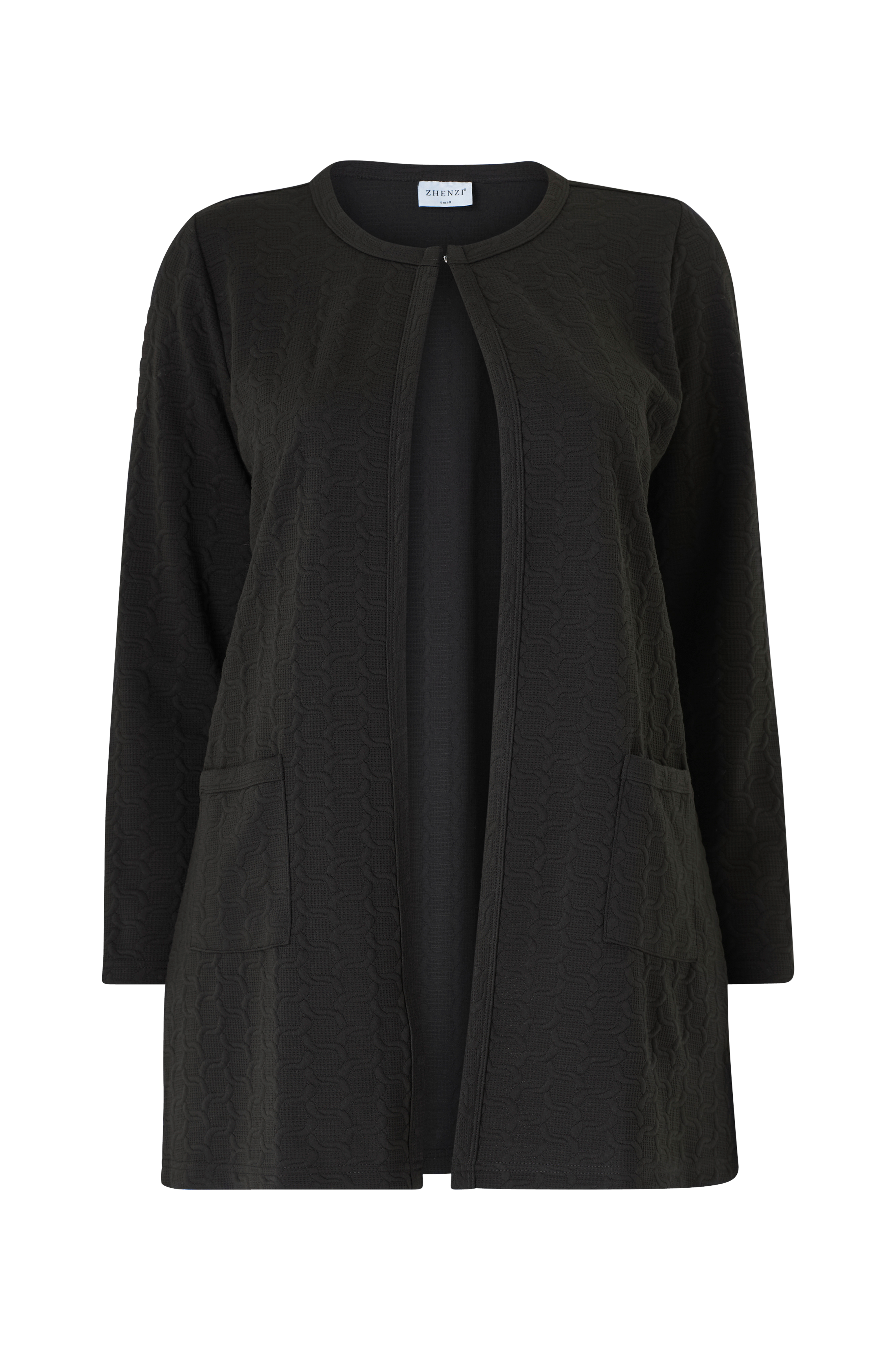 • Store størrelser• Lang, mønstervævet model• Rund hals med spændelukning foran• Langt ærme• Lommer foran
