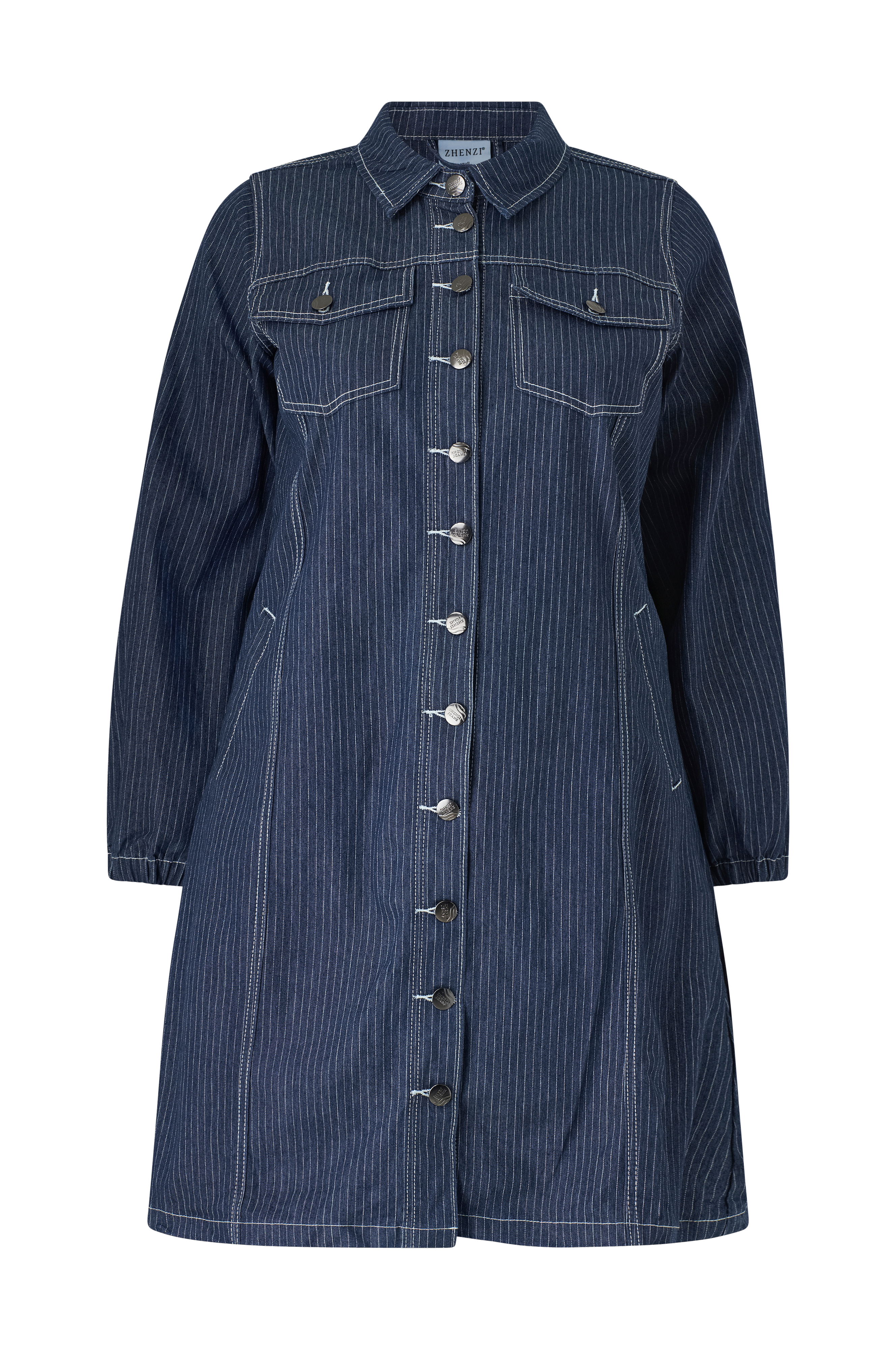 • Smalstribet skjortekjole i denim• Metalknapper hele vejen frem• Sidelommer• To brystlommer med knapbare låg• Lange ærmer med elastik ved manchetterne• Store størrelser• Længde: 101 cm i størrelse S