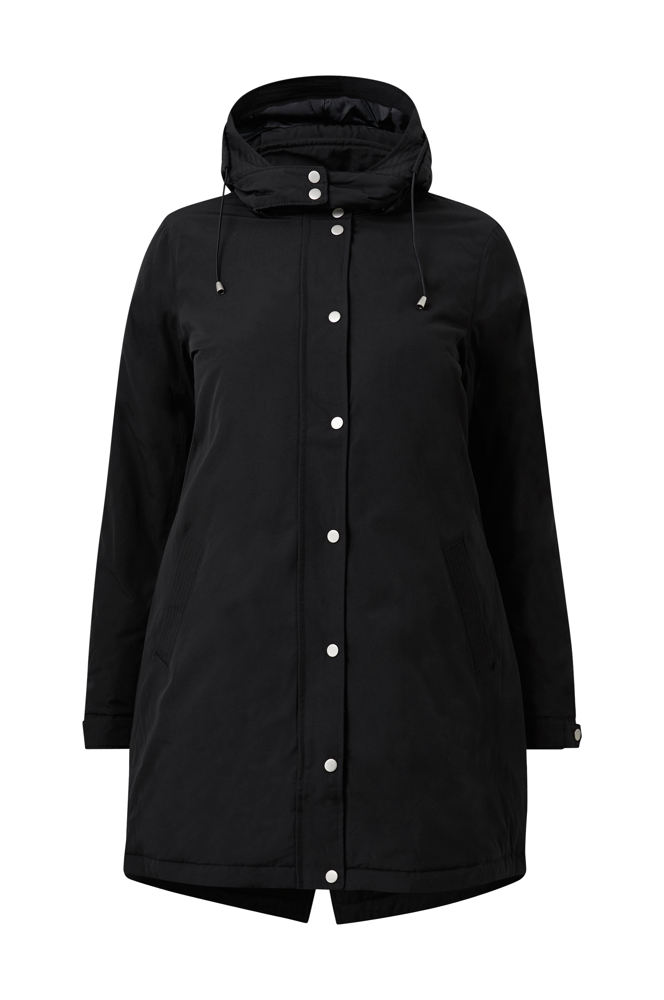 Jakke Bani 504 fra Zhenzi i mellemlang model med lynlås og trykknapper foran, to lommer og aftagelig hætte med løbegang. Skjult ribkant og tamp med trykknap i ærmekant. Lille slids i kanten forneden bagpå. Let vatteret. Længde ca. 87 cm i str. S.
