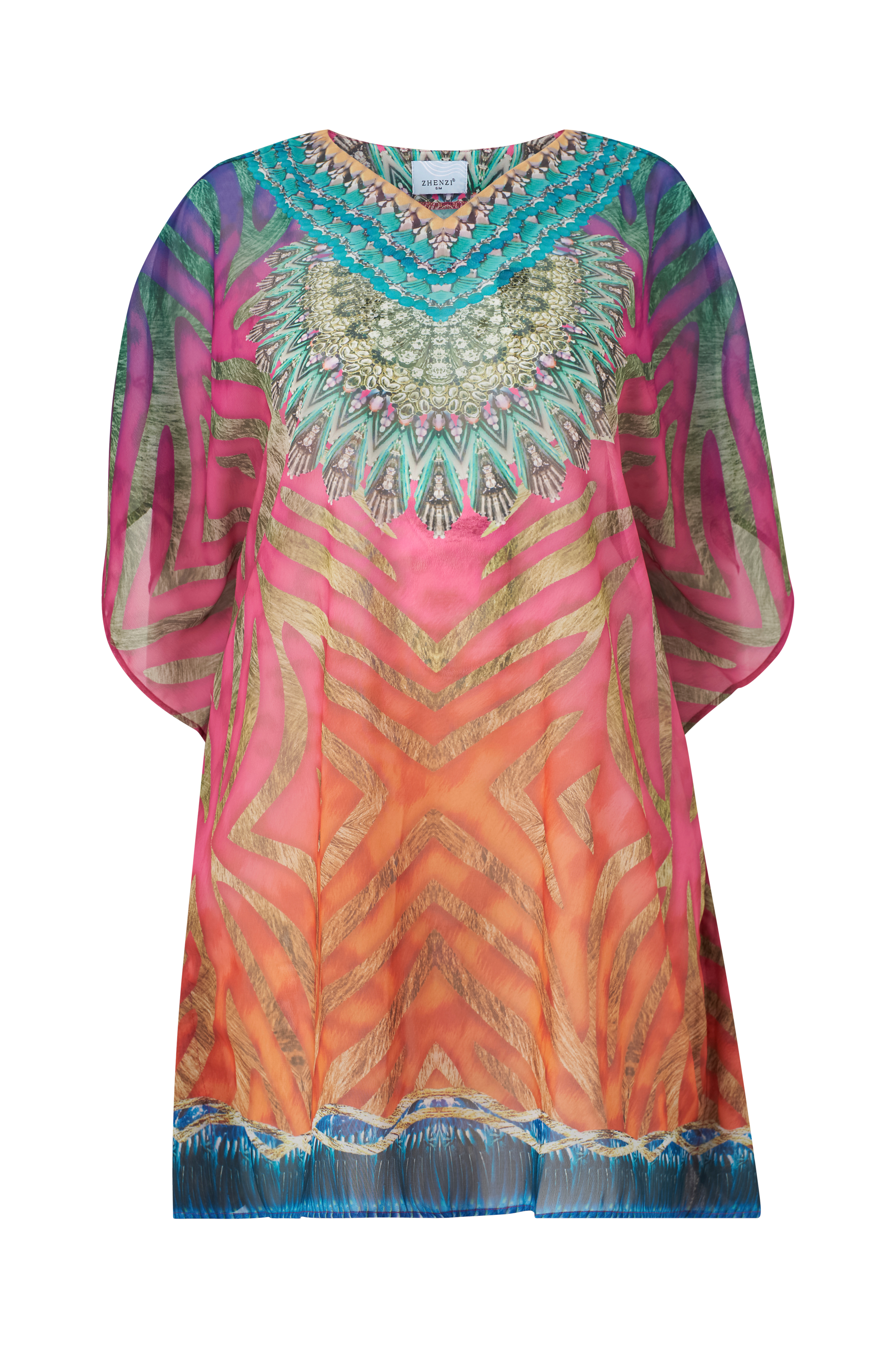 • Semitransparent stof med printet mønster• Korte, brede ærmer• Store størrelser• V-ringning• Længde: 94 cm i størrelse SM