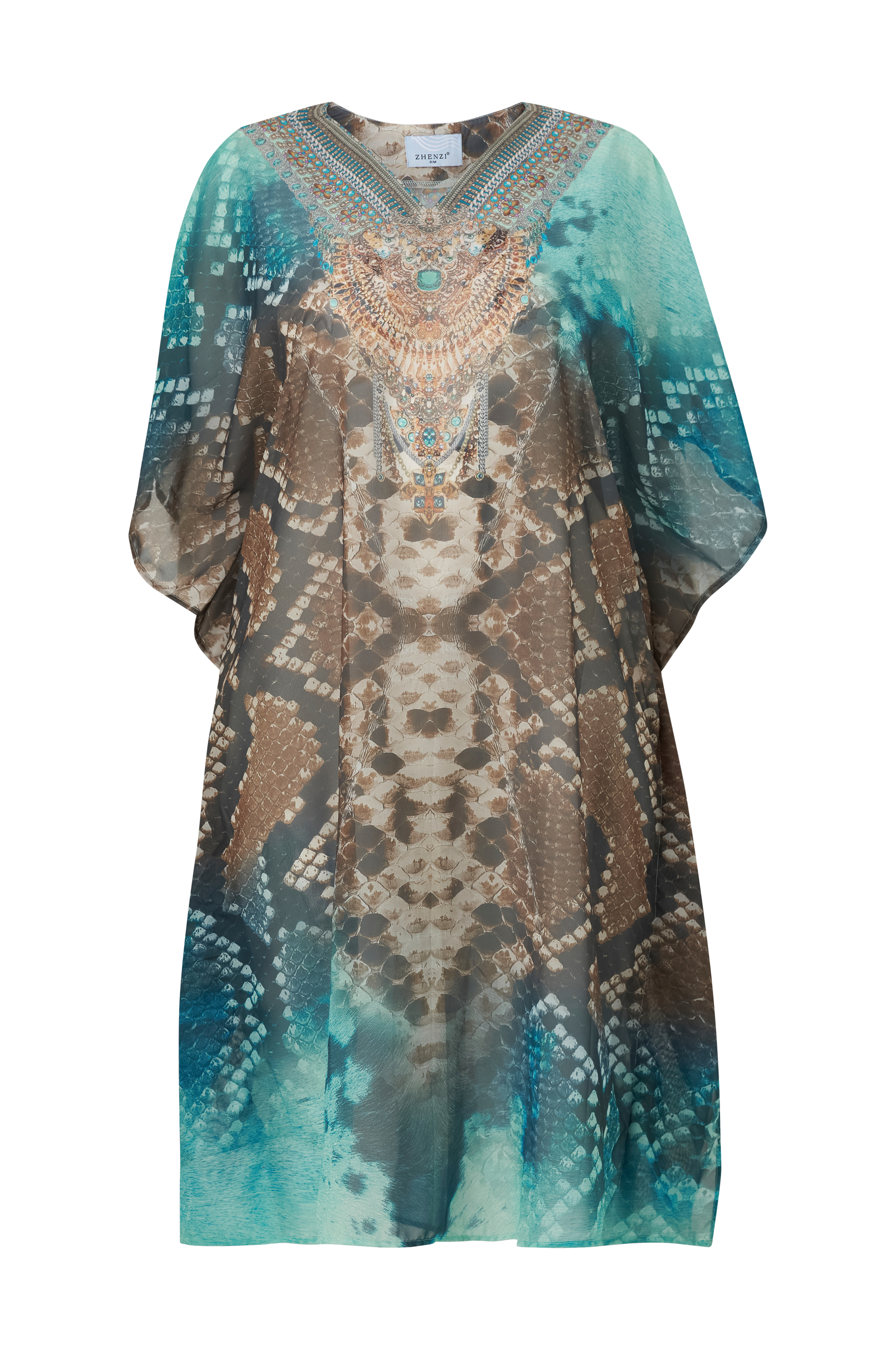 • Semitransparent stof med printet mønster• Korte, brede ærmer• Store størrelser• V-ringning• Længde: 94 cm i størrelse SM