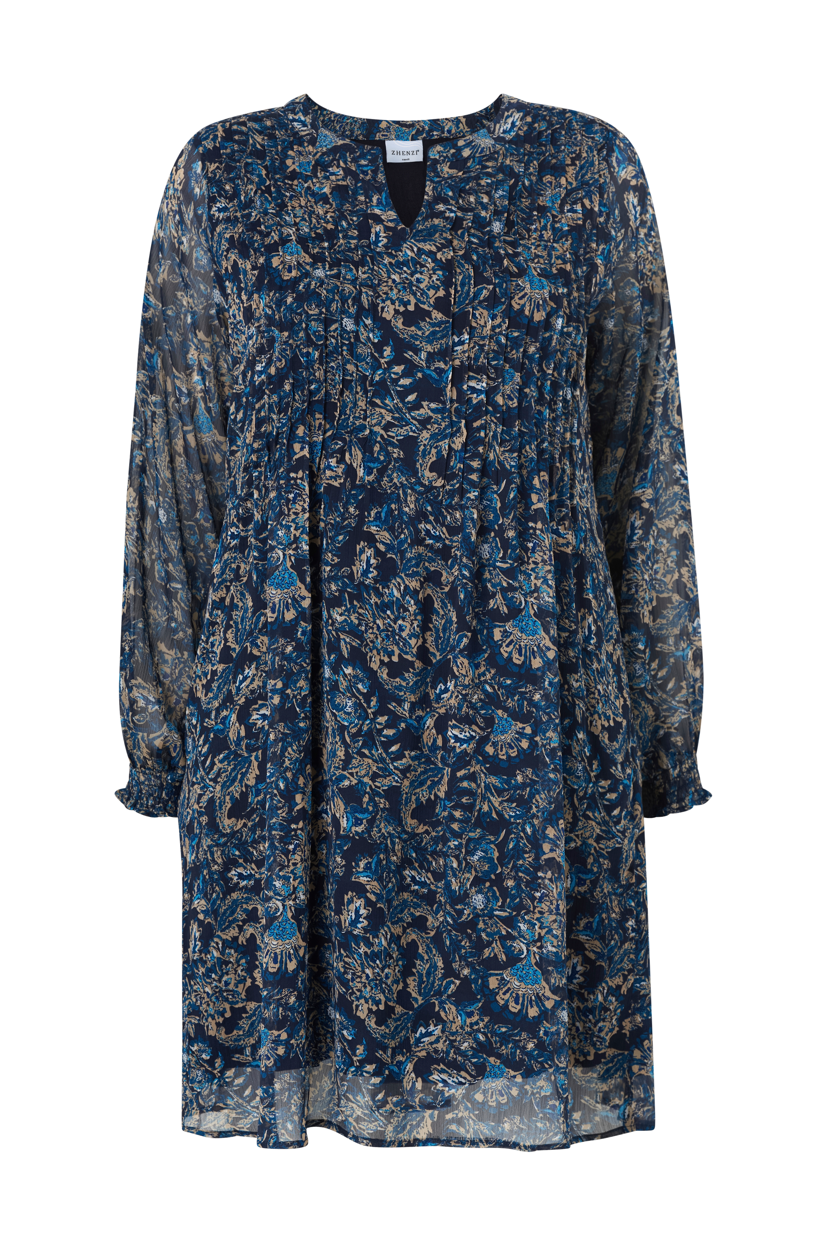 • Store størrelser• Model med svaj i chiffon• Rund hals med ventilation foran• Syede biselæg på brystet• Ekstra langt ærme med elastiksømme nederst• Tyndt, syet bindebånd ved taljen• Foret• Længde: 102 cm i størrelse S