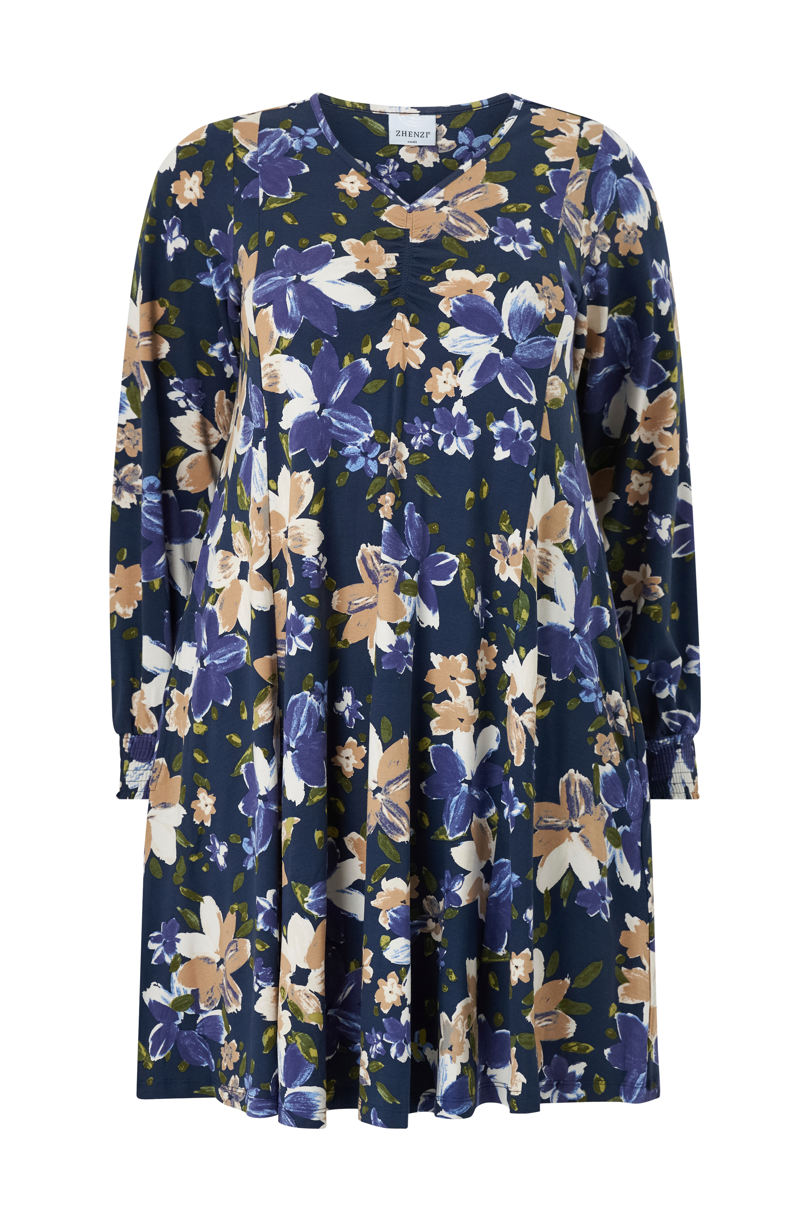• Kjole i elastisk viskose med et printet mønster• V-udskæring• Rynket detalje midt foran• Lange ærmer med smock ved manchetterne• Sidelommer• Store størrelser• Længde: 104 cm i størrelse S