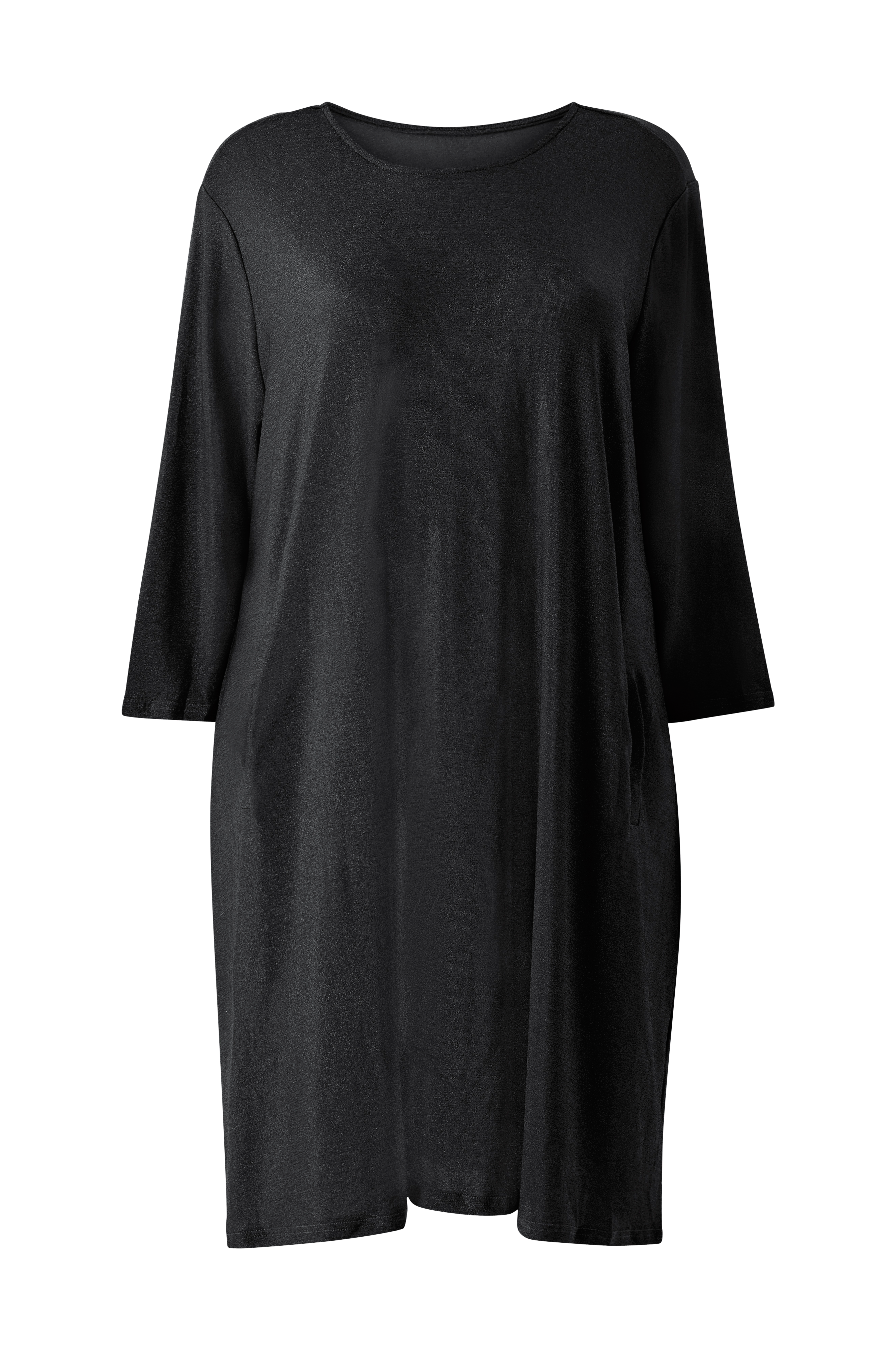 • Kjole i glitrende jersey• Rund hals• V-udskæring med dekorative stropper bagpå• Lommer i siderne• Store størrelser• Længde: 110 cm i størrelse XXL
