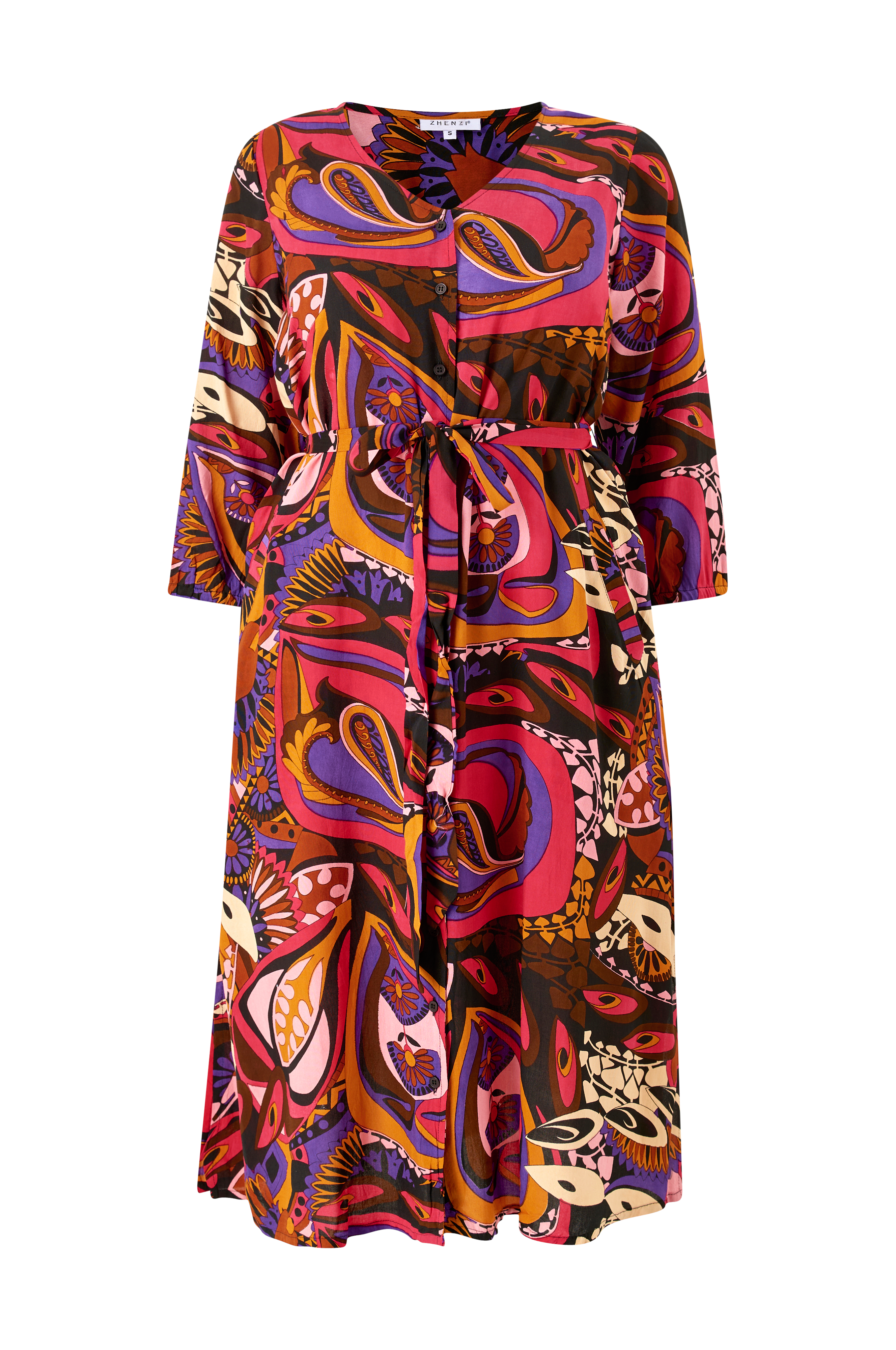 • Store størrelser• Model med svaj med bindebælte ved taljen• V-formet halsudskæring• Bredt, 3/4 langt ærme med elastisk manchet• Knapper hele vejen frem• Længde: 122 cm i størrelse S