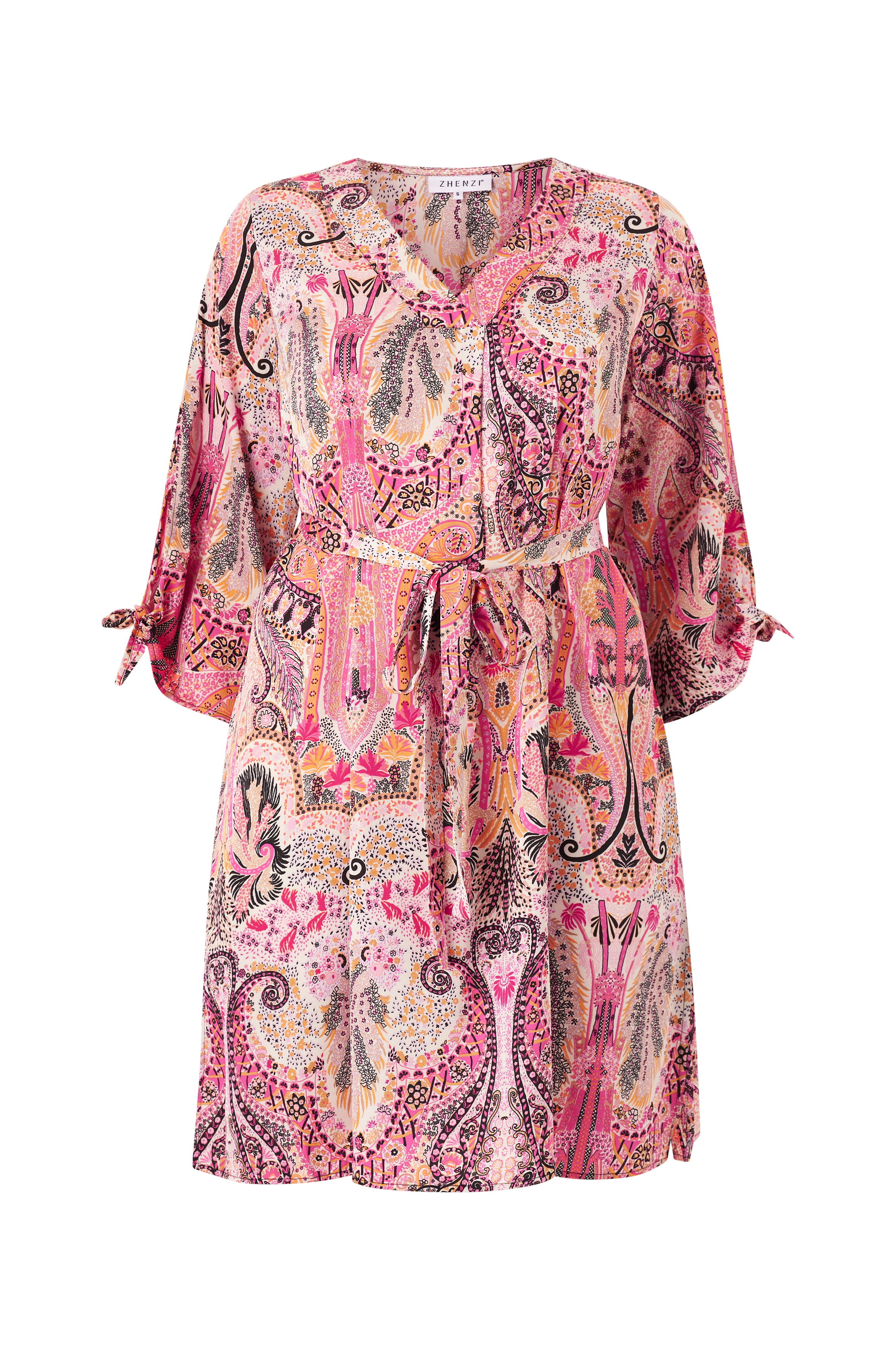 • Mønstret kjole i satin• V-udskæring• 3/4 lange ærmer med snøring ved manchetterne• Bindebælte ved taljen• Store størrelser• Længde: 103 cm i størrelse
