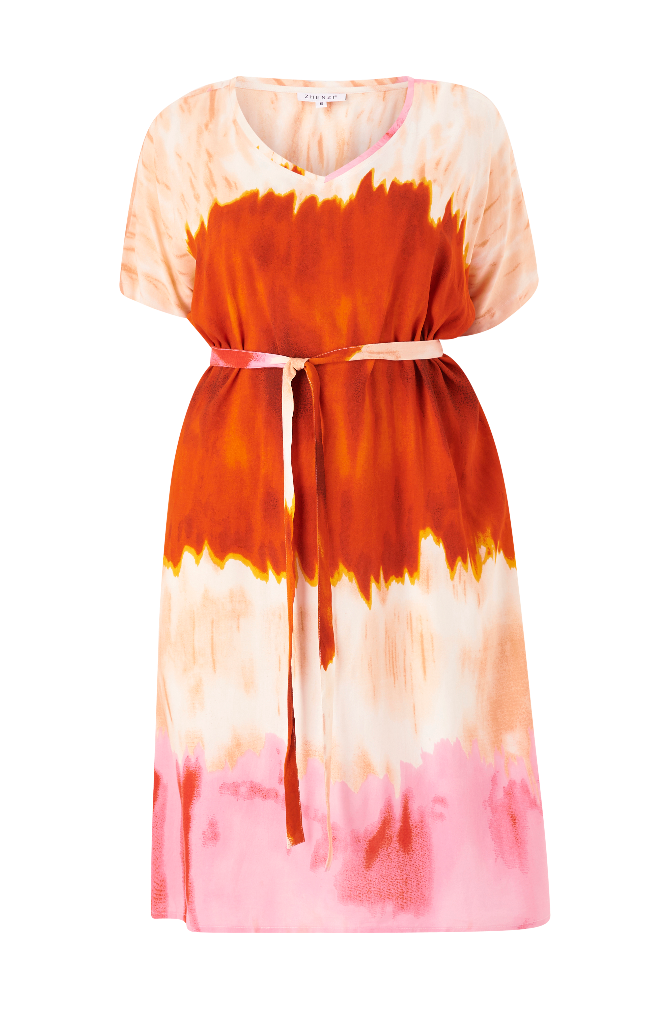 • V-udskæring• Korte ærmer• Bindebælte ved taljen• Slidser i siderne• Store størrelser• Længde: 111 cm i størrelse S