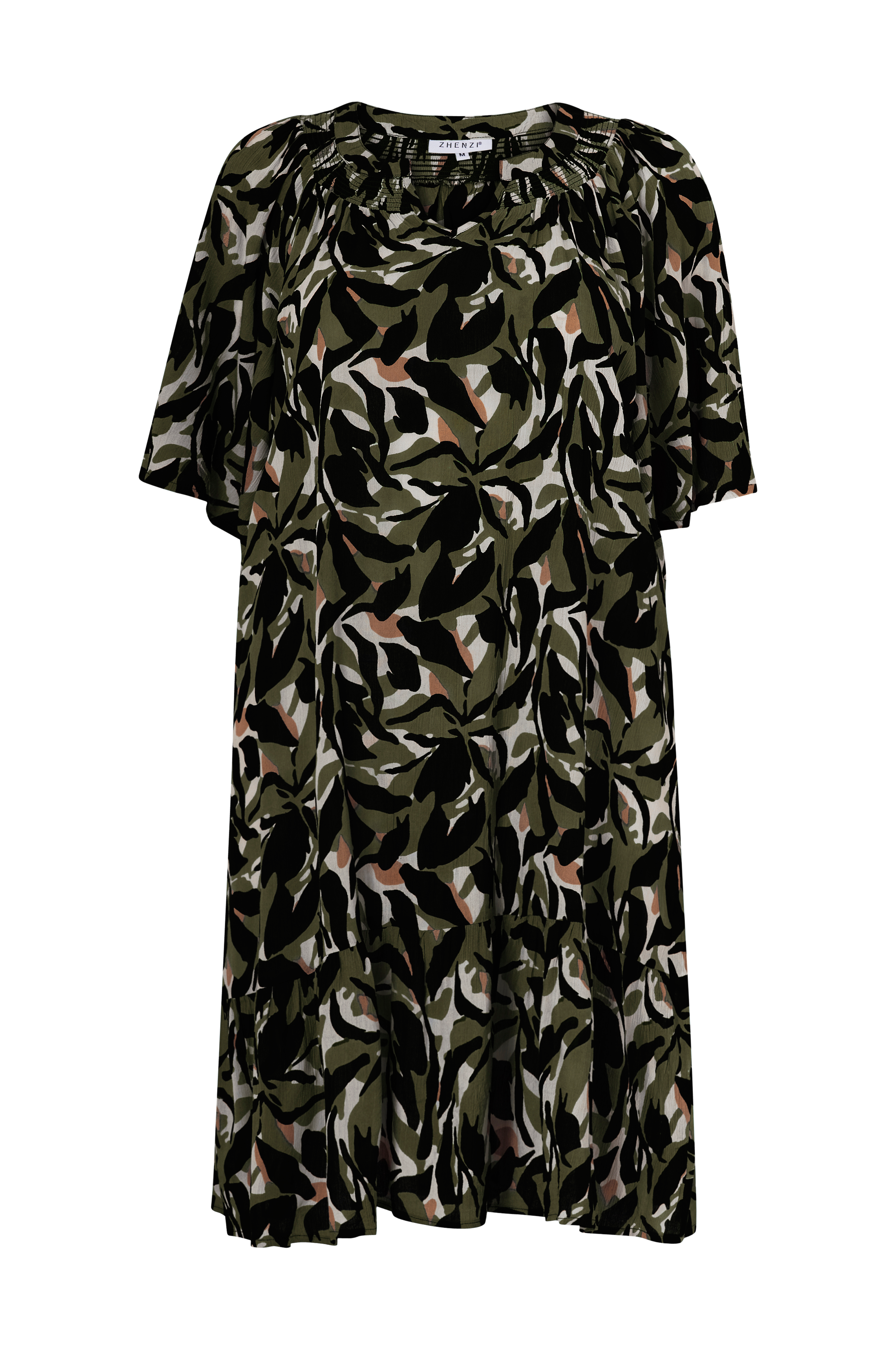 • Store størrelser• Halvlange, brede sommerfugleærmer• Rund hals med smock og ventilation foran• Volant nederst• Let krøllet kvalitet• Længde: 110 cm i størrelse M