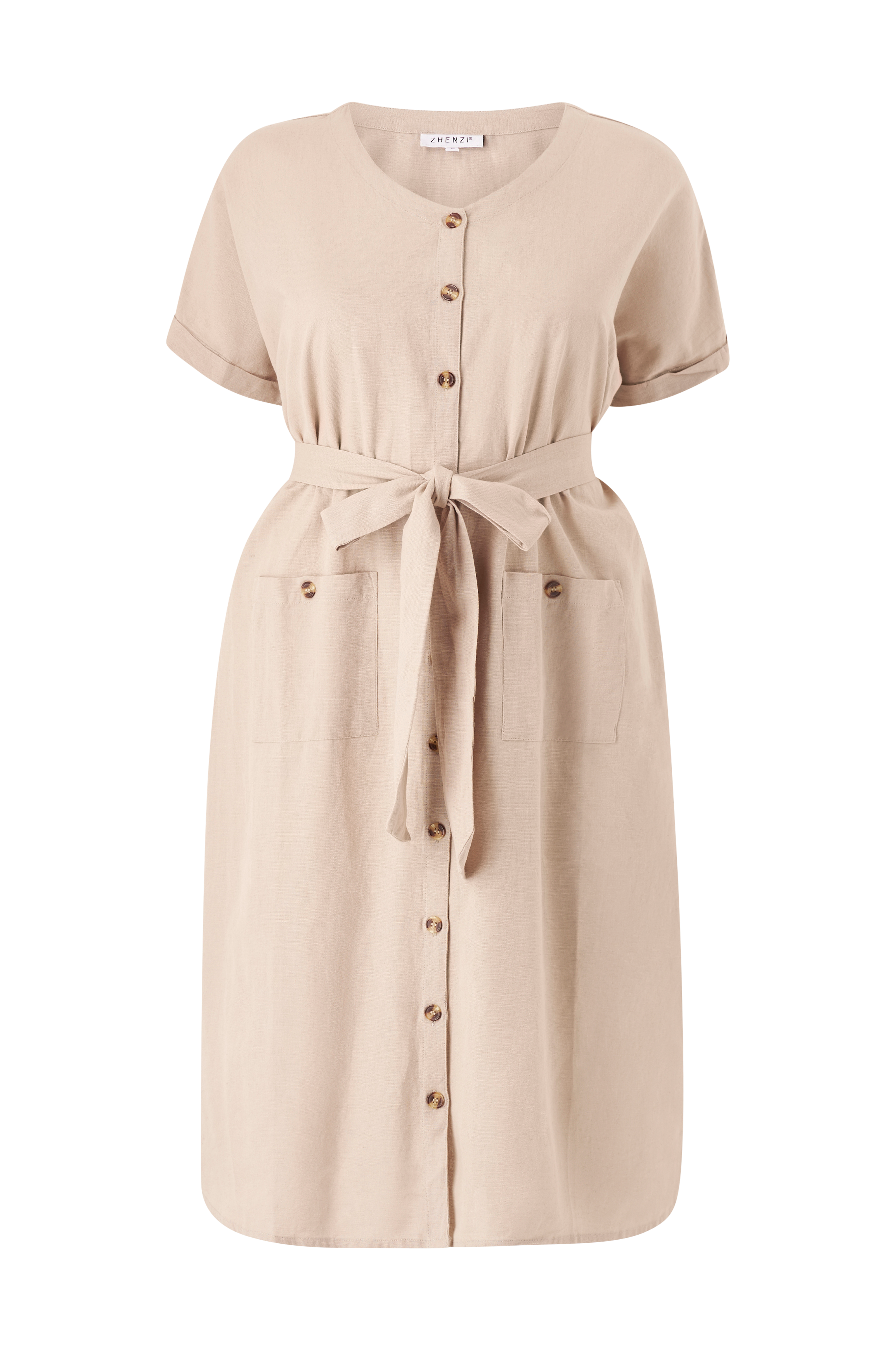 • Kjole i hørblanding• Rund halsudskæring• Knapstolpe hele vejen frem• Korte ærmer med syede ærmeafslutninger• Aftageligt bindebælte ved taljen• To lommer med knap• Store størrelser• Længde: 113 cm i størrelse S