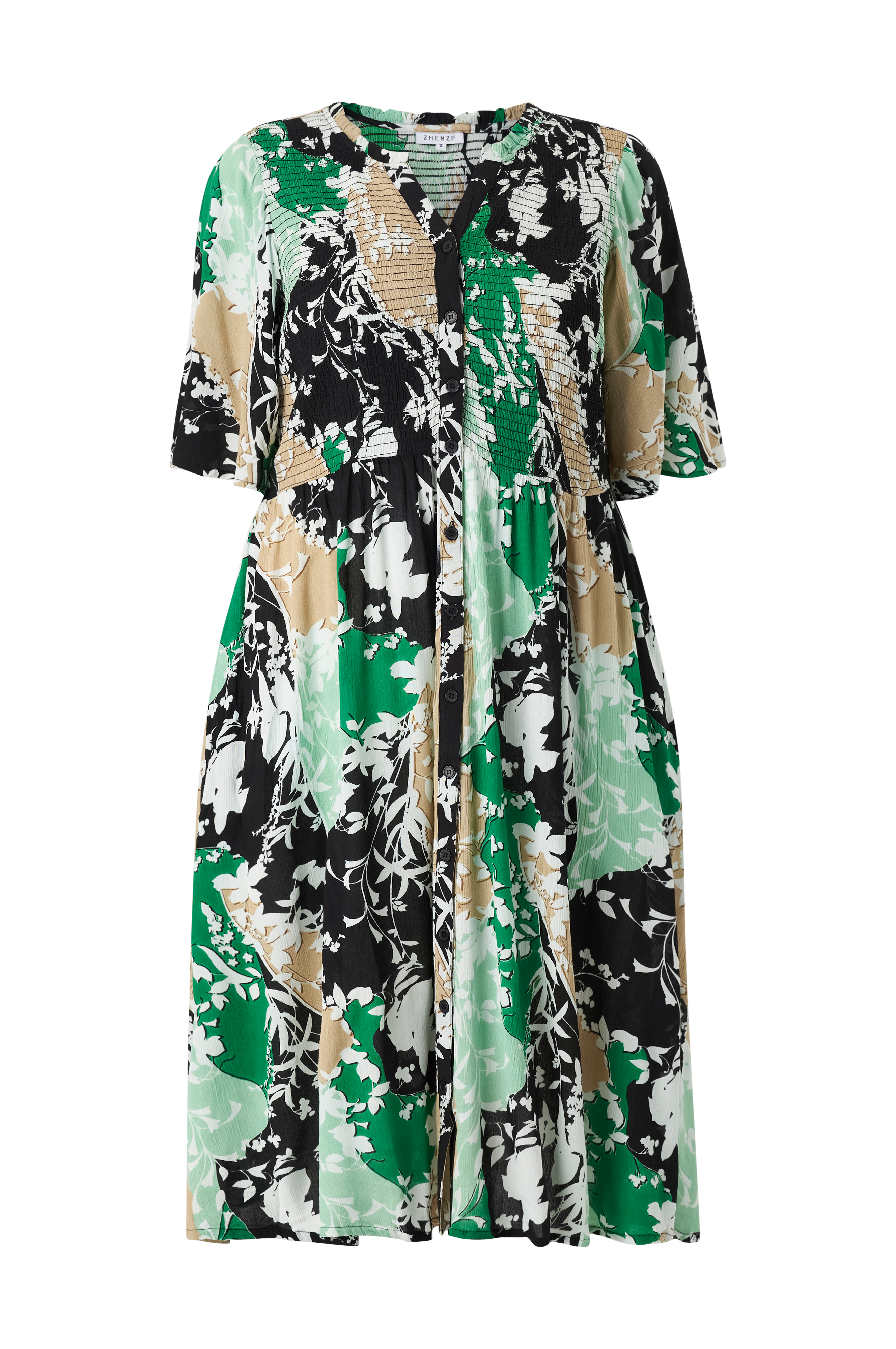 • Mønstret kjole i viskose• Knapper foran• Smock på toppen• Brede, halvlange ærmer• Lommer i siderne• Store størrelser• Længde: 116 cm i størrelse S