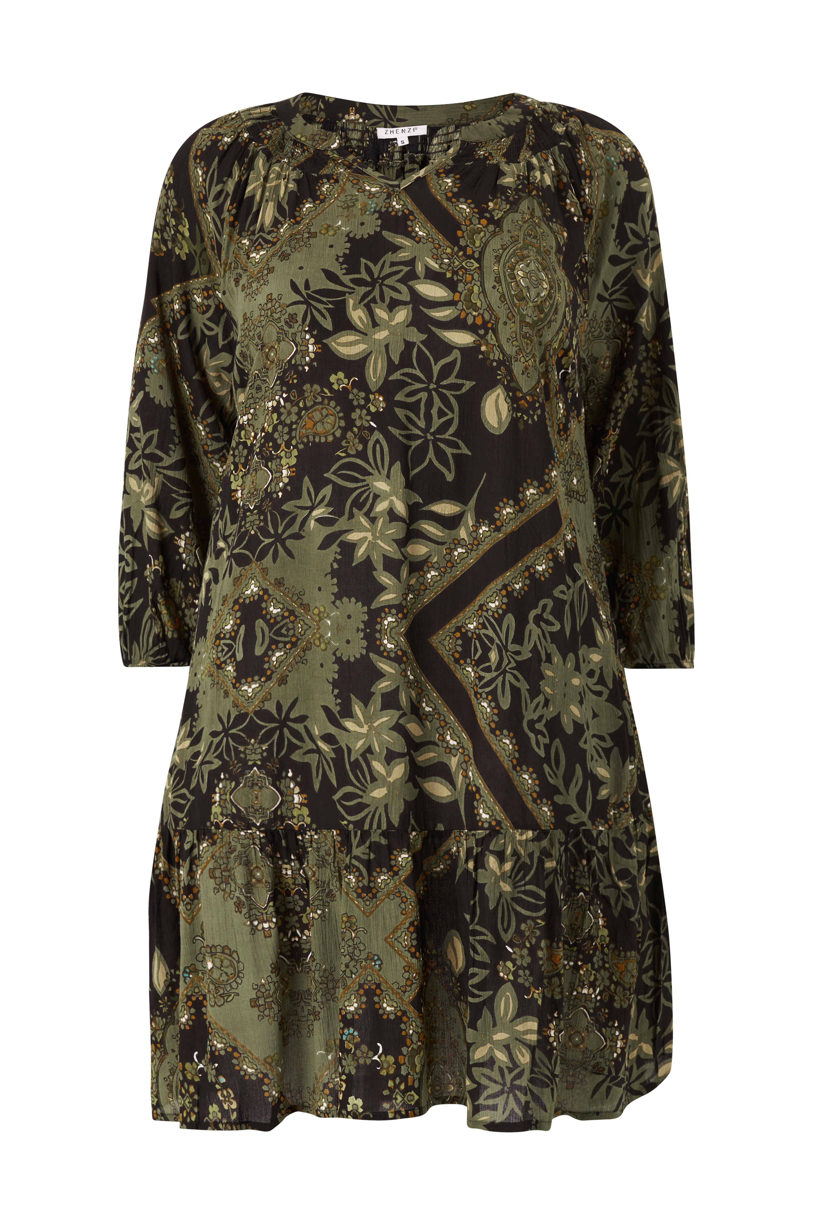 • Store størrelser• Model med svaj• Halsudskæring med smock hele vejen rundt og ventilation foran• Bredt raglanærme med elastisk manchet• Bred volant nederst• Længde: 103 cm i størrelse S